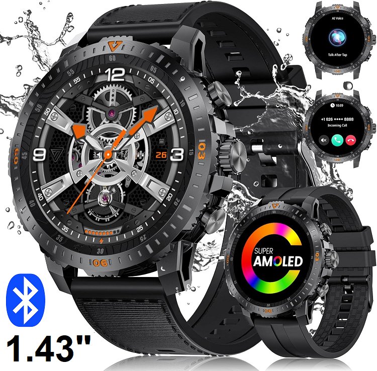 ESFOE MILITARY SMART WATCH WITH MULTIPLE MODES - IP68 - HEART RATE, SLEEP, SPO2, BLOOD PRESSURE, TACTICAL OUTDOOR RUGGED TOUCHSCREEN WATCH FOR IOS/ANDROID - 1.43" DISPLAY (MODEL: fv7)