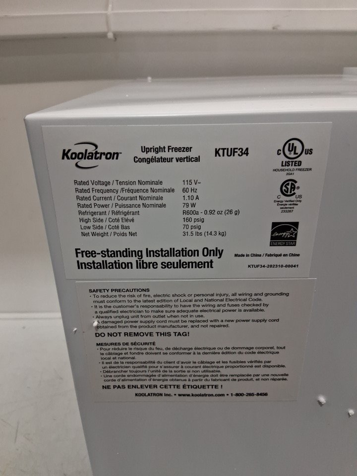 KOOLATRON COMPACT UPRIGHT PORTABLE CUBE mini fridge FREEZER - 1.2 CUft/34l - WHITE (MODEL: KTUF34)