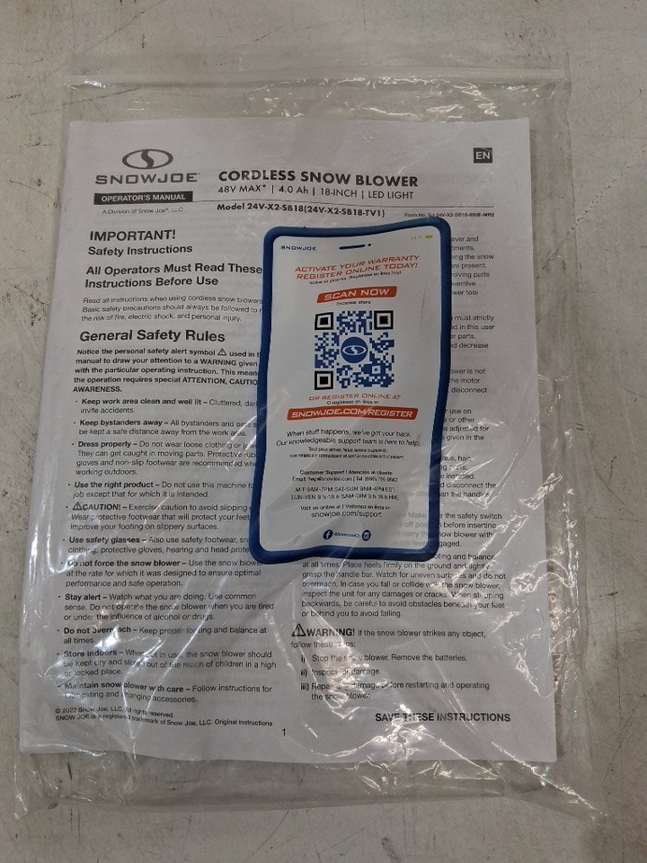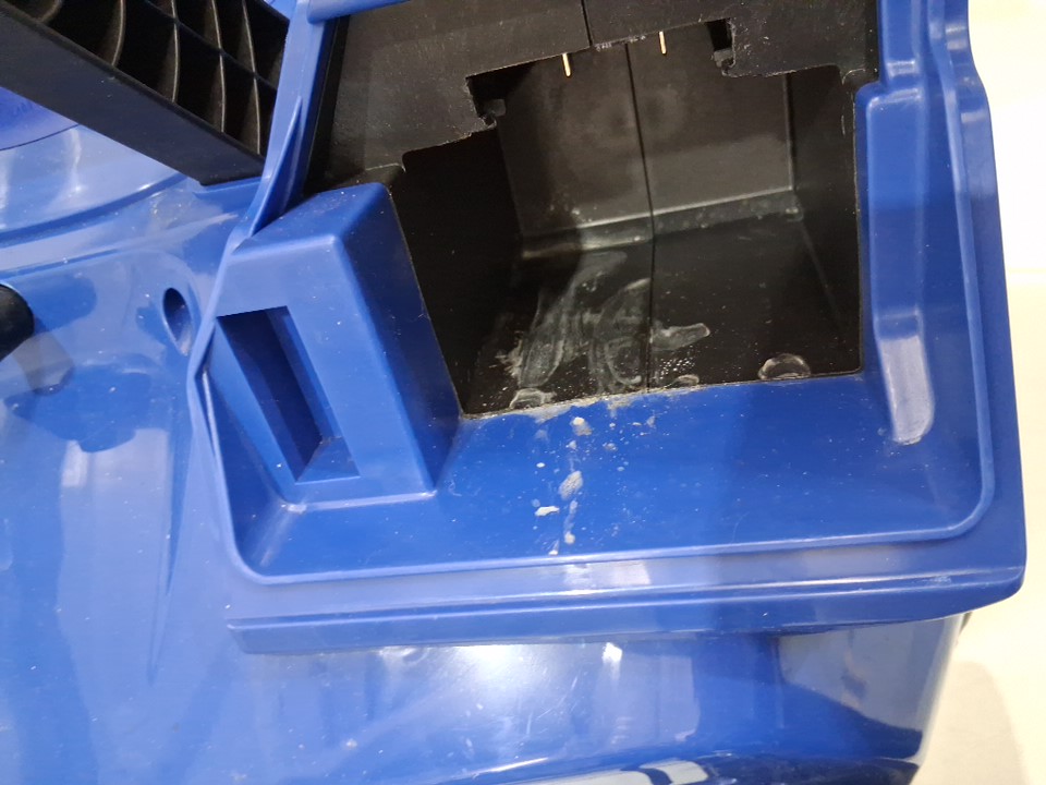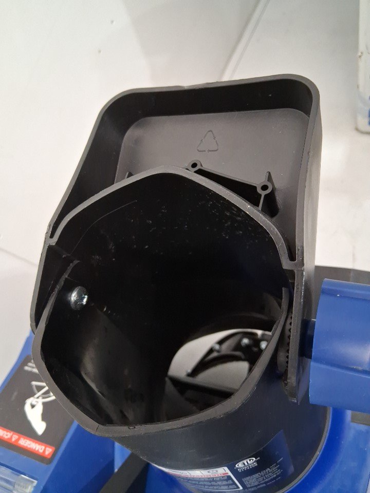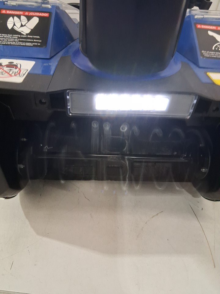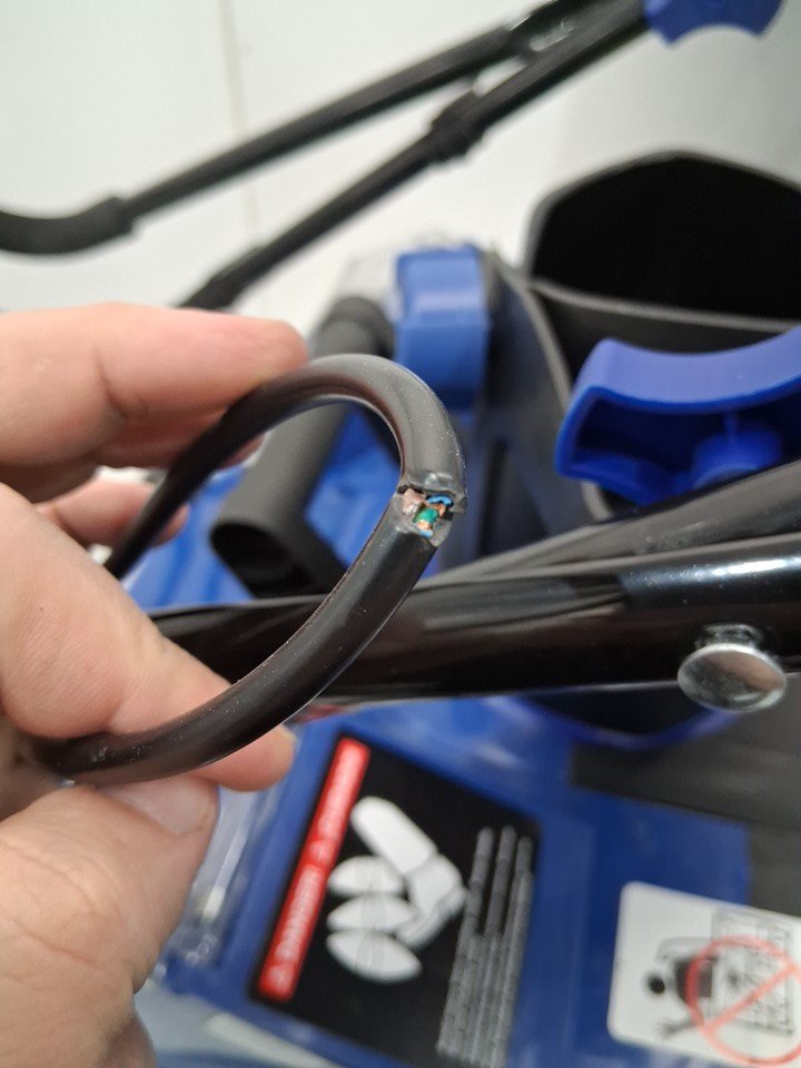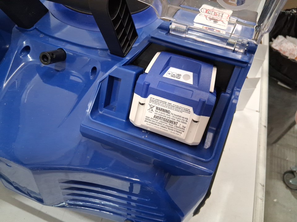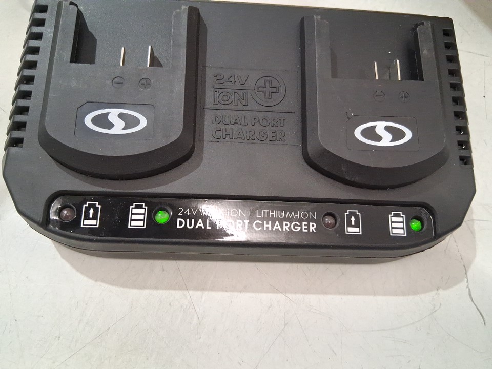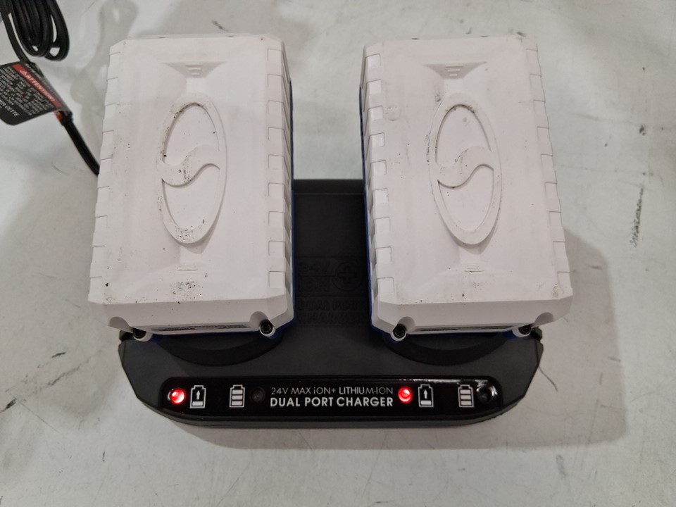 The cord leading to the power switch has a small cut in it which appears to be severing one of the internal wires. In spite of this, the blower appears to function normally, but repairing the wire is likely a good idea in order to avoid any further damage or issues with operation. One of the battery compartment covers is also coming slightly loose, and one part of the blade appears to be slightly bent out of shape. Additionally, there is a fair amount of dirt/moisture stains on and around the blade, as well as on the exterior of the machine including inside of the battery compartments, indicating prior use - please see photos. Tested for power and basic function, charger and batteries also appear to function and charge as normal.