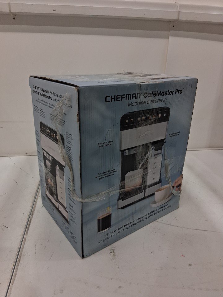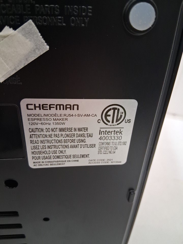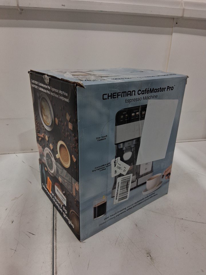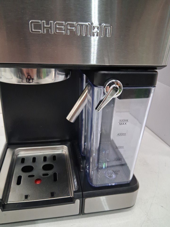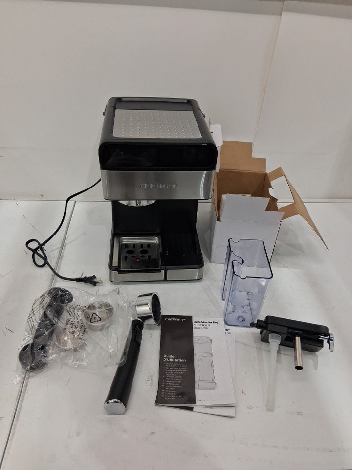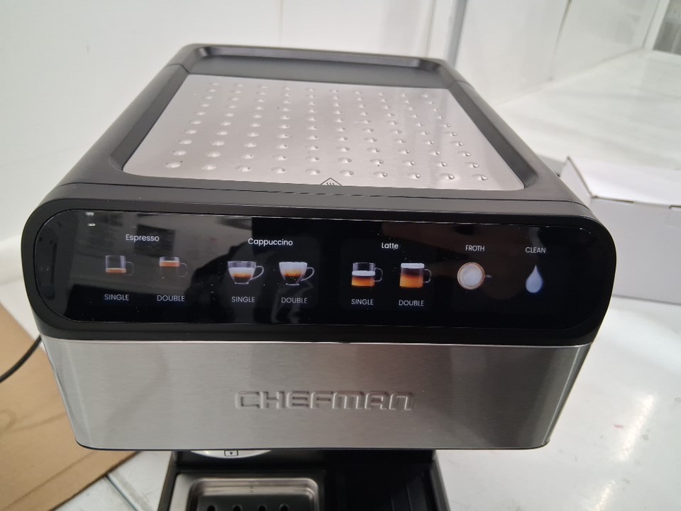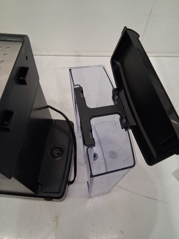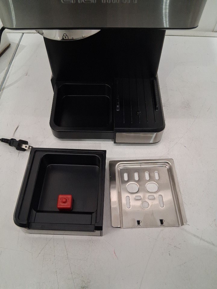 Coffee residue in espresso chamber and water residue in water tank due to prior use. Tested for power.