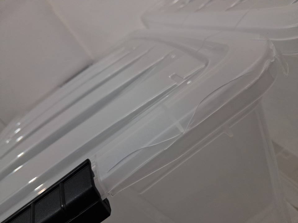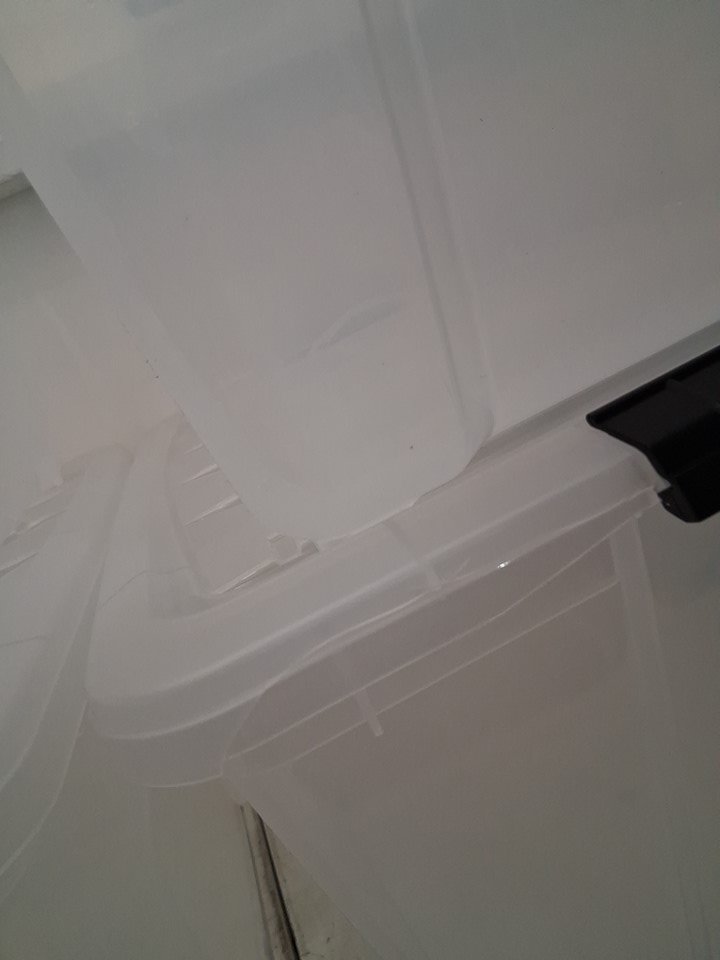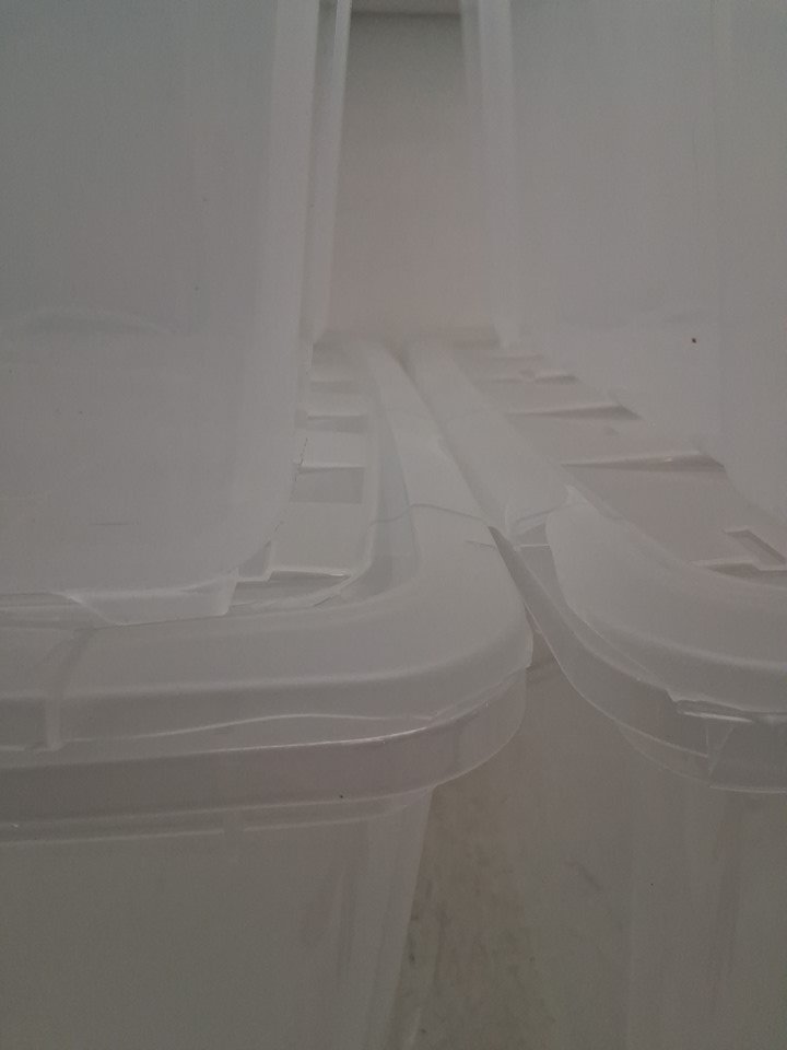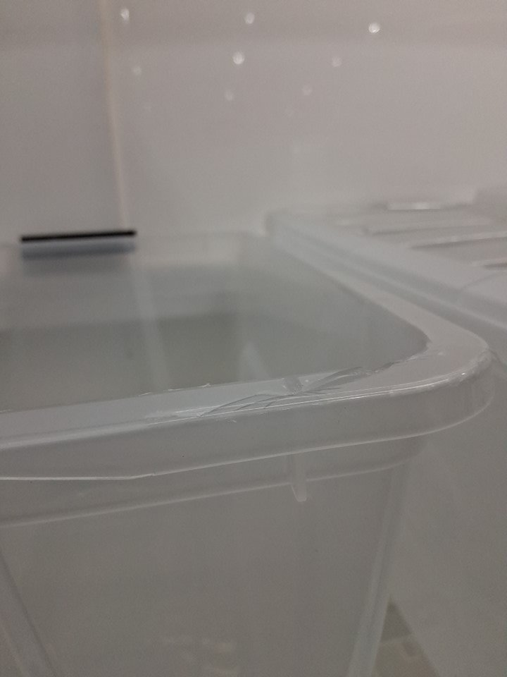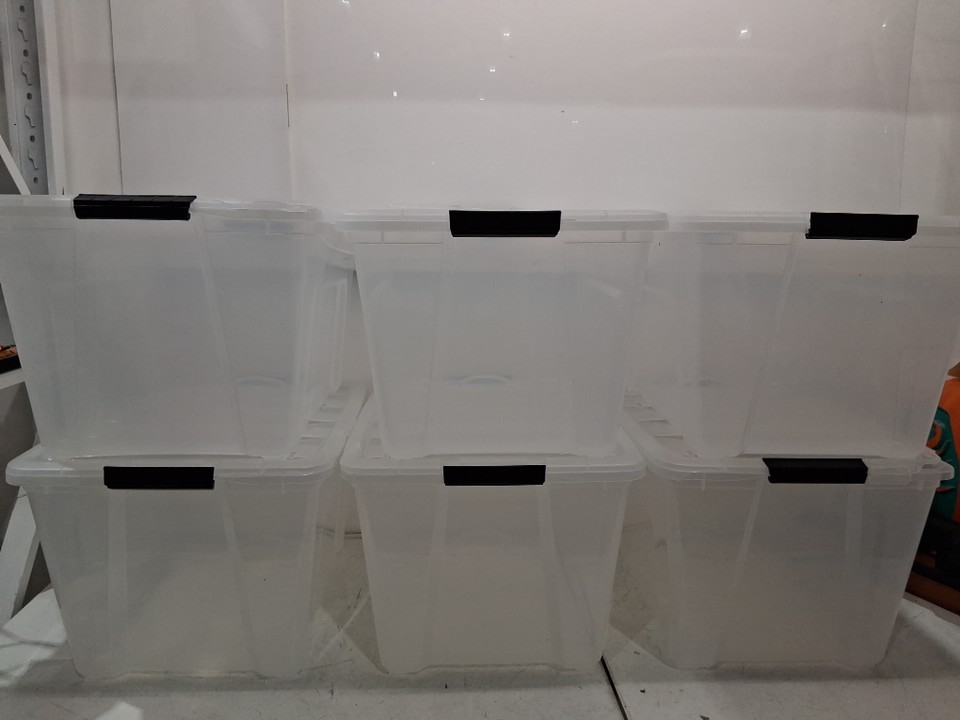 1 of the totes has a crack around the rim on one side, all of the lids (6) have small cracks on them presumably from shipping. please note, the lids clip into place but unsure on the security/ sturdiness of them