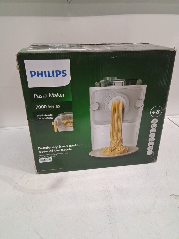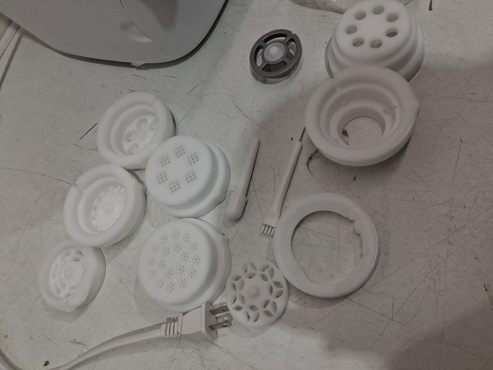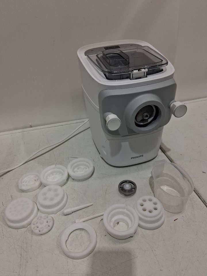 PLEASE note that the item has signs of light use - there is some flour residue on the top of item- it also is missing the scraper to scrap the pasta off - item was tested for power- see photos