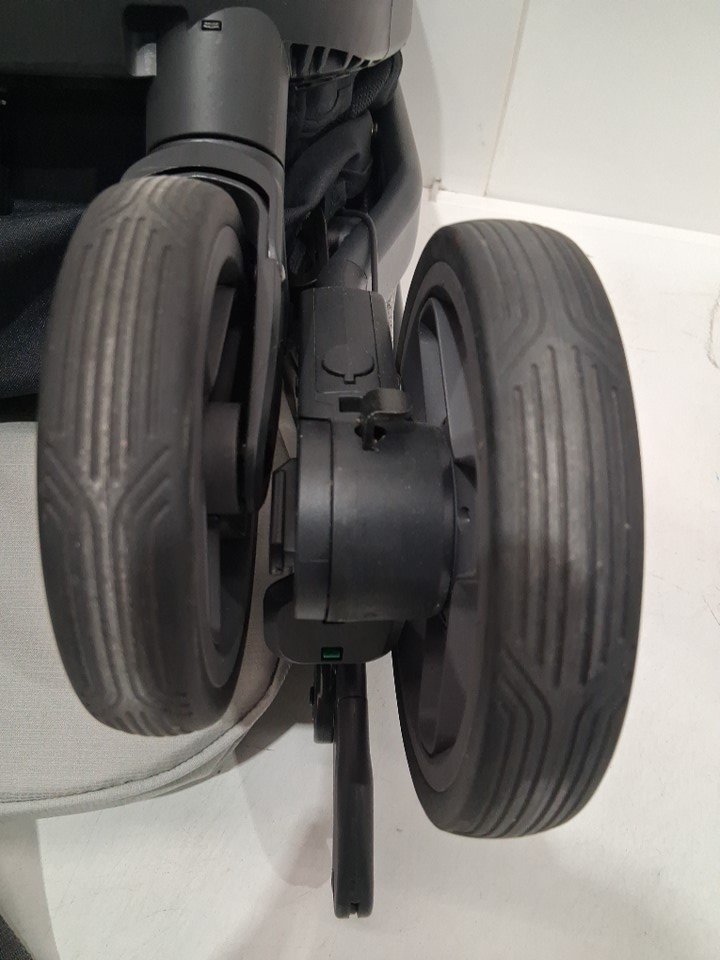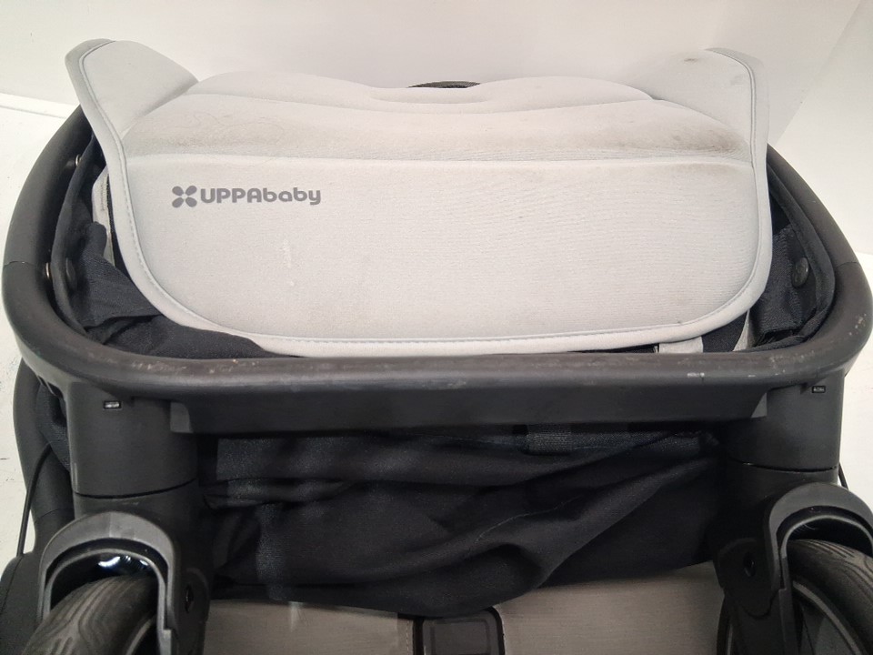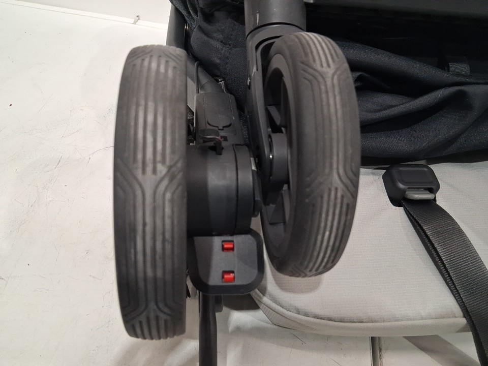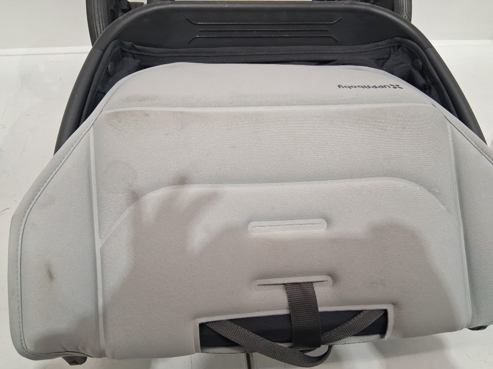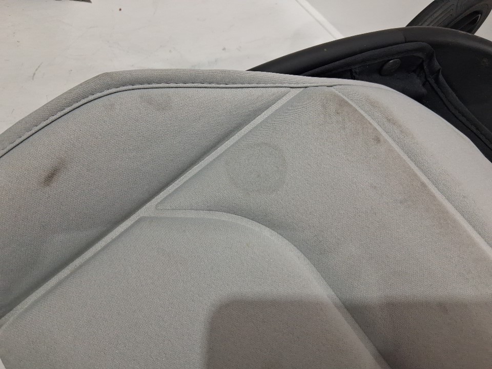 wheels show signs of use, stains on various parts of the fabric, scratches on some of the plastic