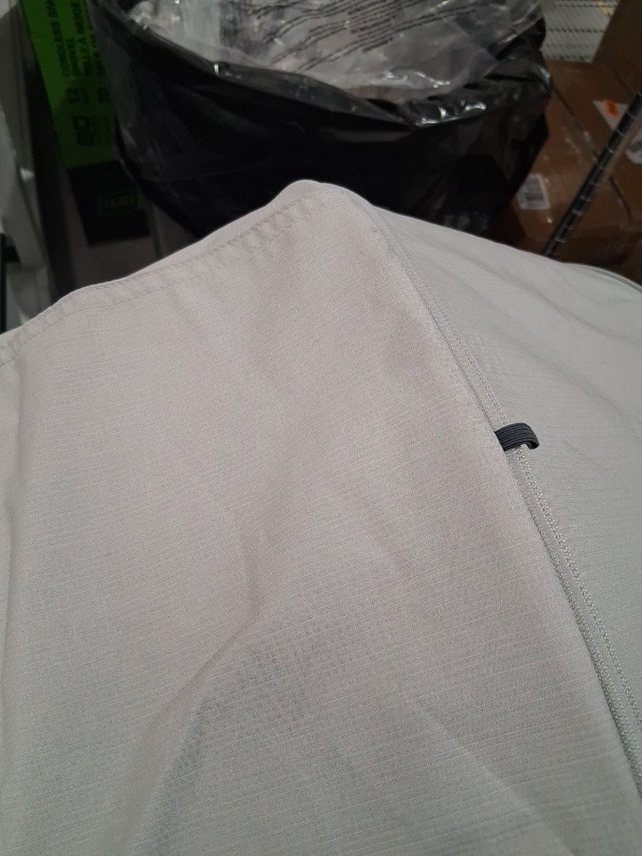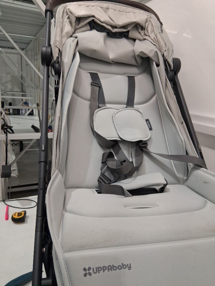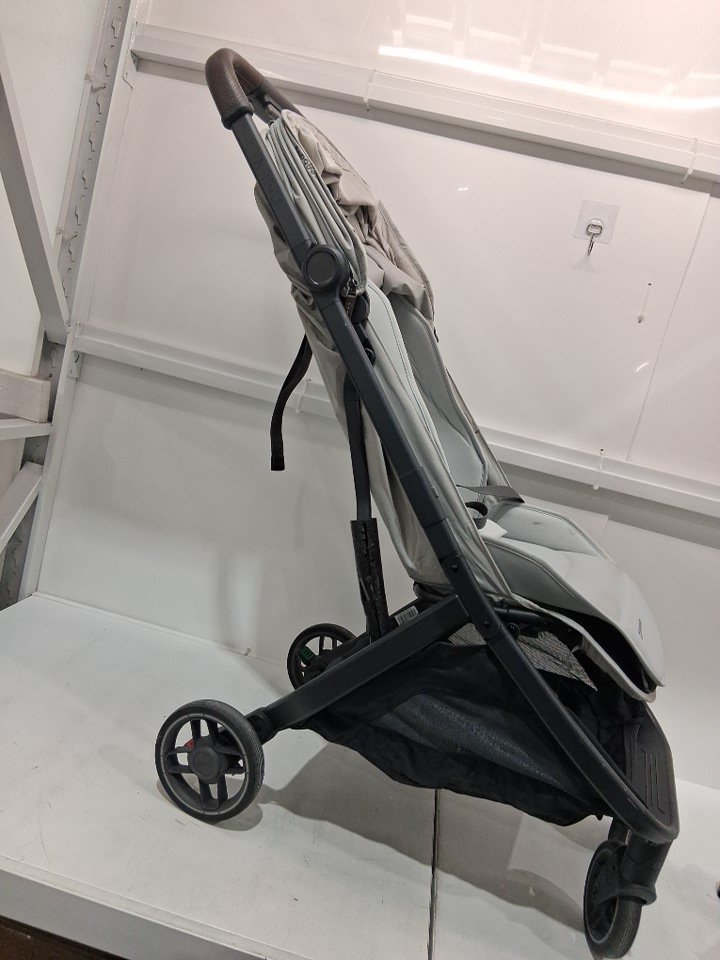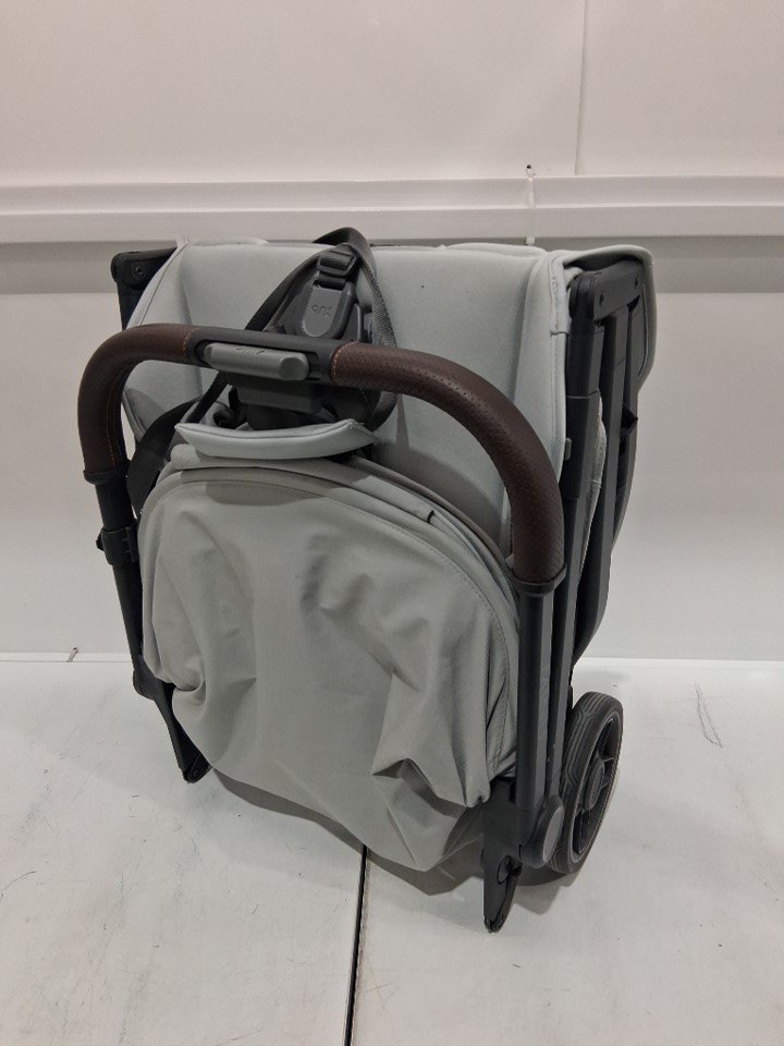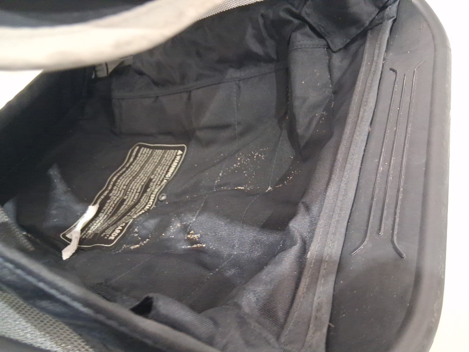 wheels show signs of use, stains on various parts of the fabric, scratches on some of the plastic
