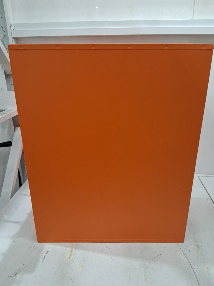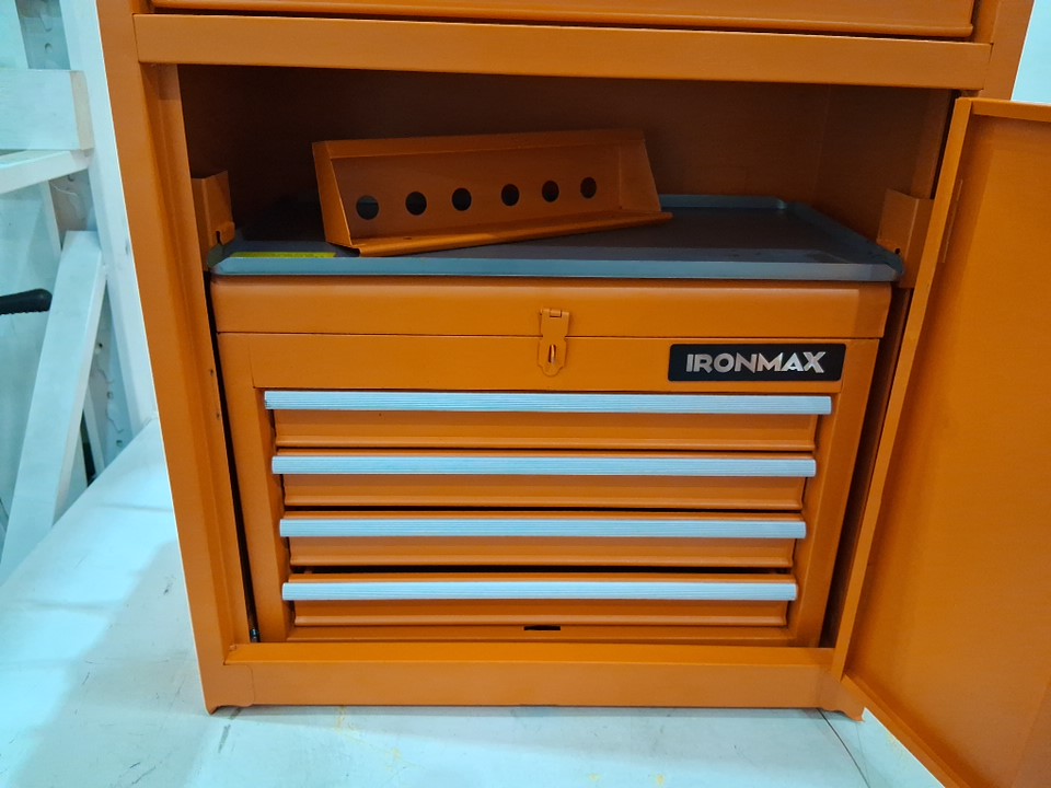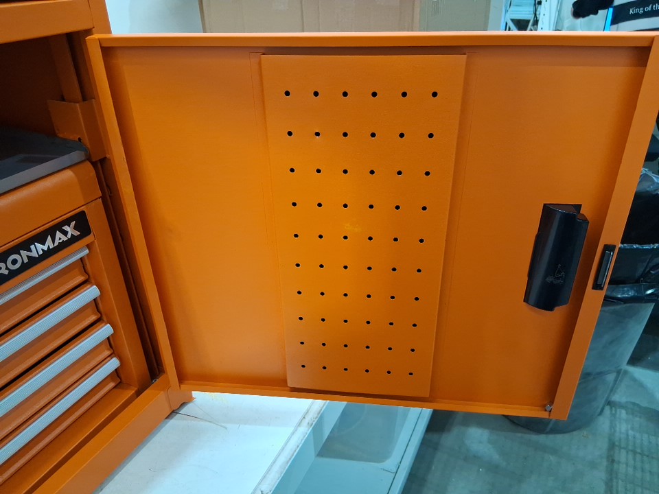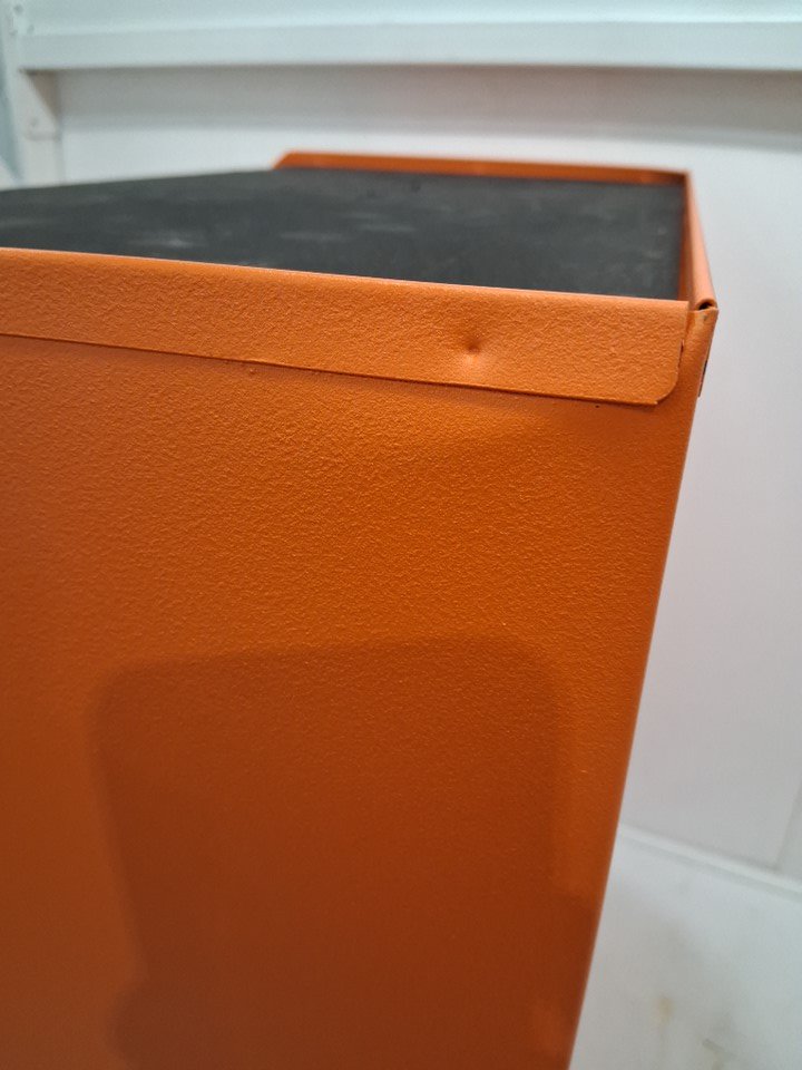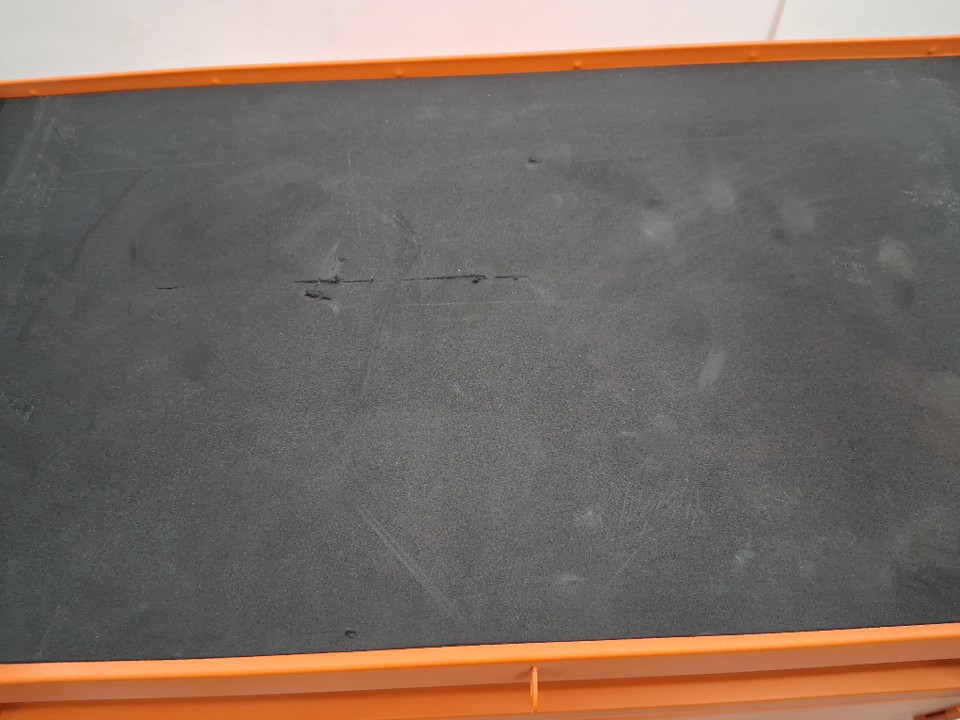 The foam pads on the top of the main cabinet and inside of the cabinet's drawer have received some damage due to shipping/handling, there is also a small dent near the top of the right side of the cabinet - see photos. Outside of this damage all parts appear to be in good condition with no obvious signs of use, though customer may need to provide some extra hardware themselves (screws, etc) in order to attach the wheels, as some appears to have gone missing during shipping.