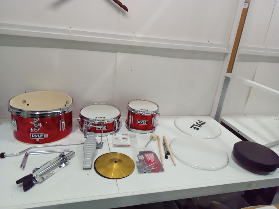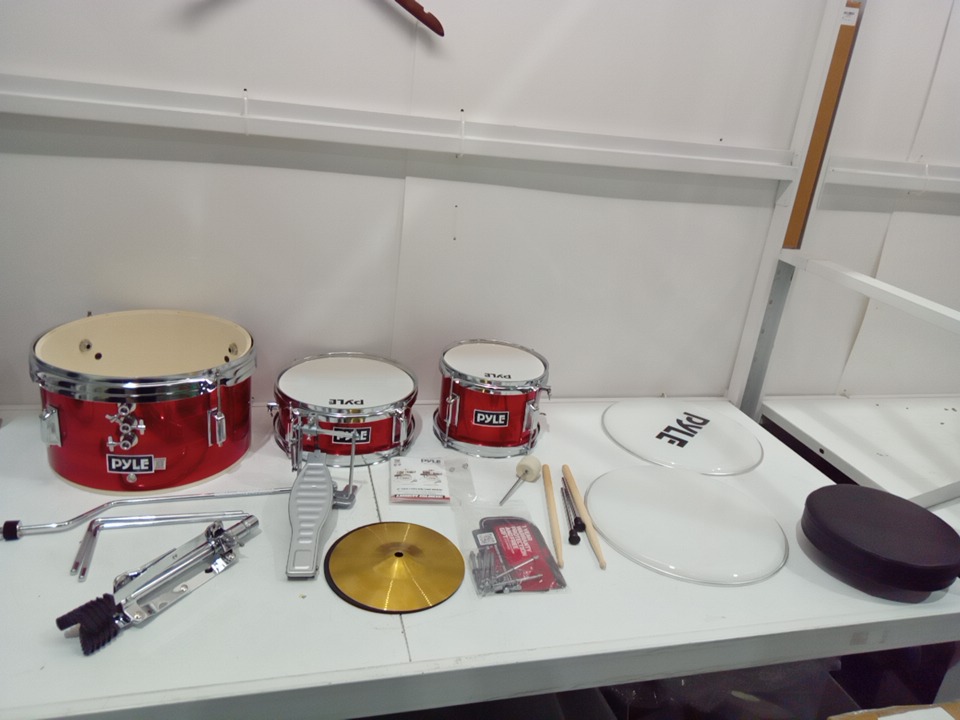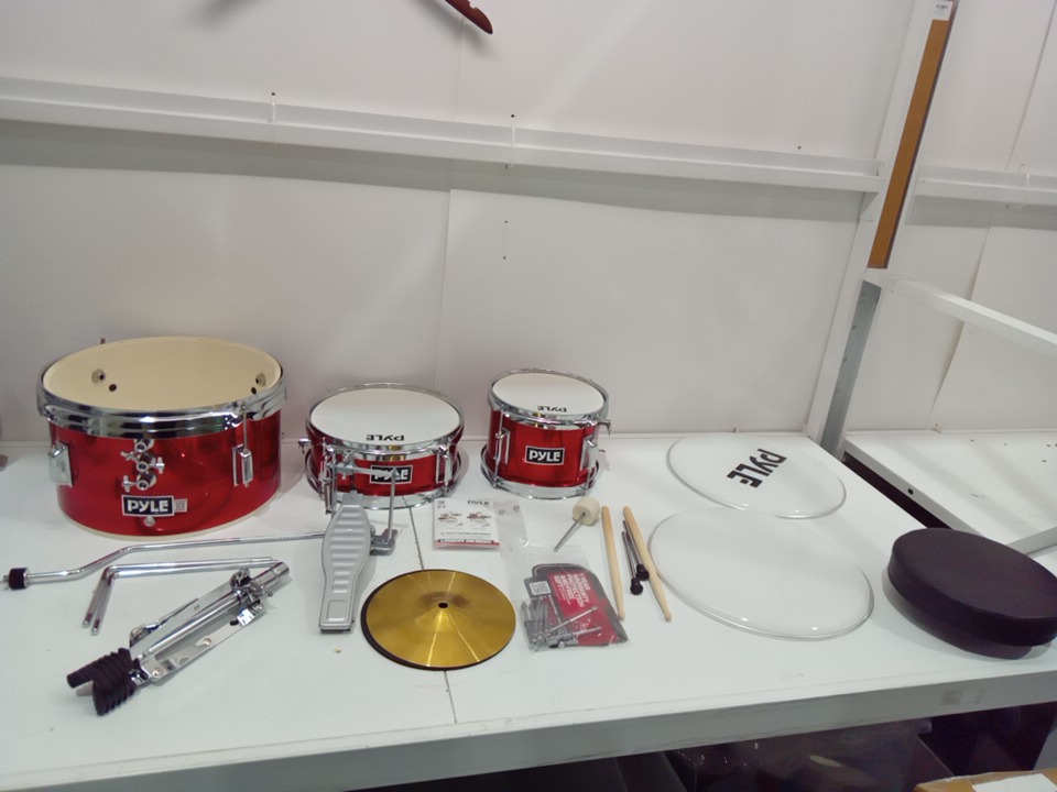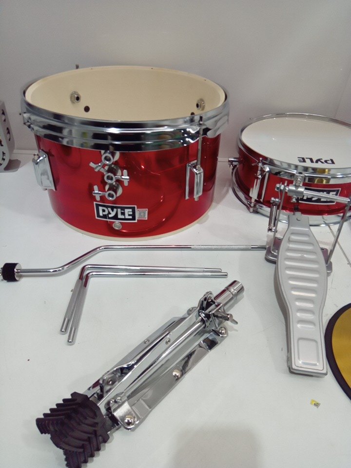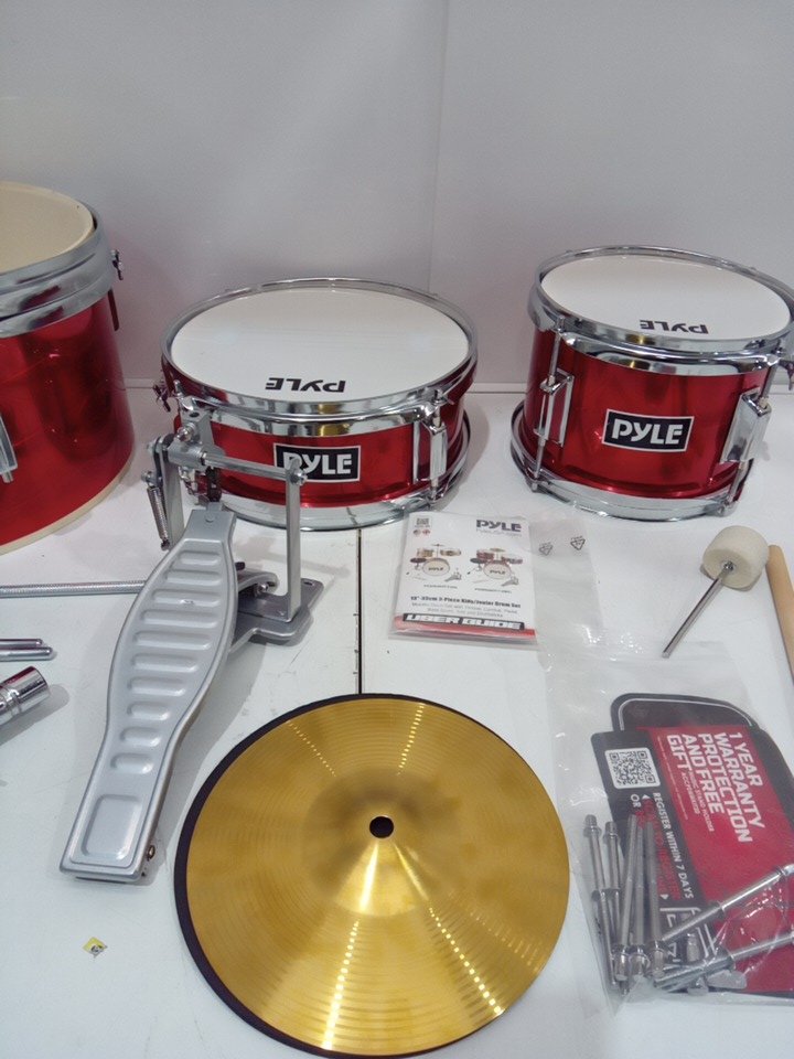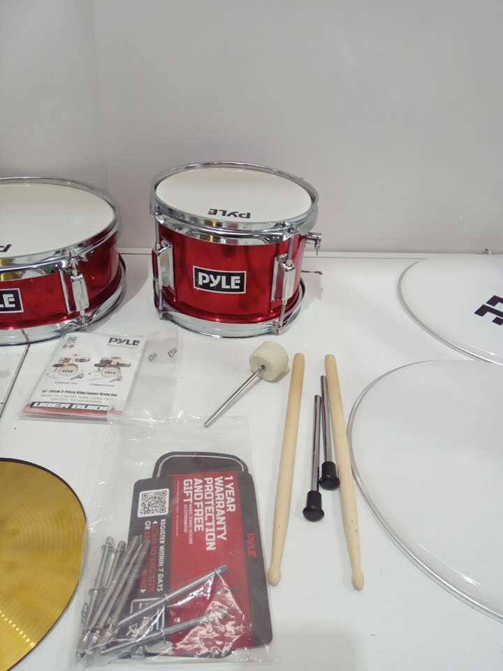 3PC Kids PYLE Drum Set Beginner Kit Metallic Finish with Adjustable Throne – Red (PDRMKIT72RD)