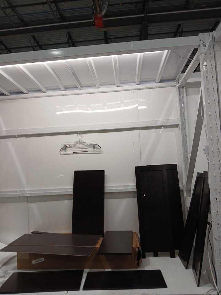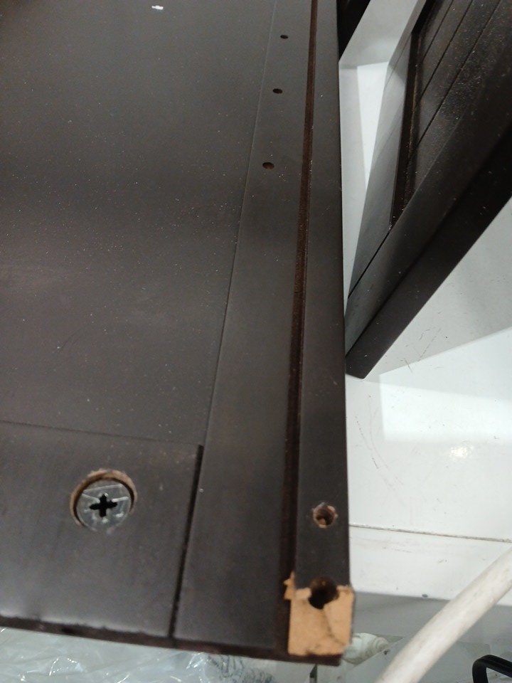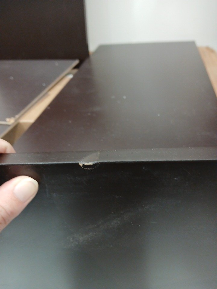 Has some chipping in the shelves and other panels. On of the corners is damaged. May require hardware.