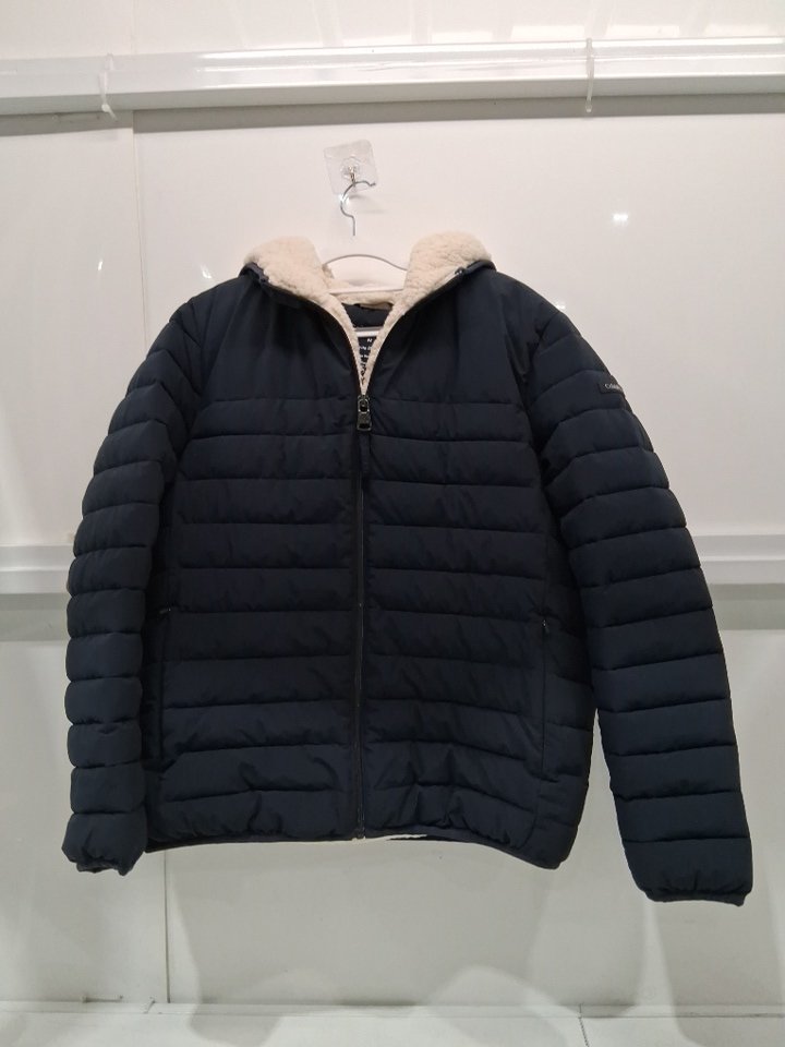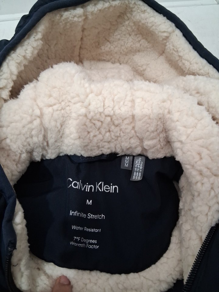 mens Calvin Klein Hooded Down Jacket, Quilted and Sherpa Lined - size MEDIUM - true navy (style: CM155780)