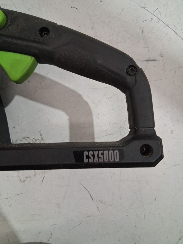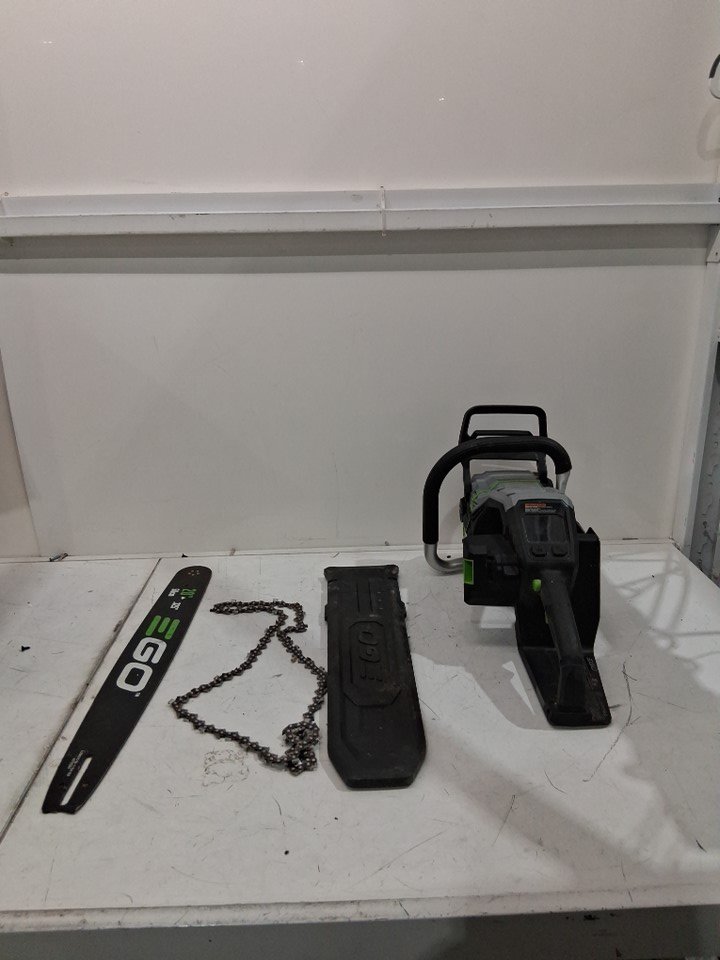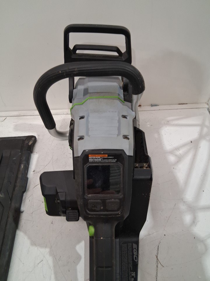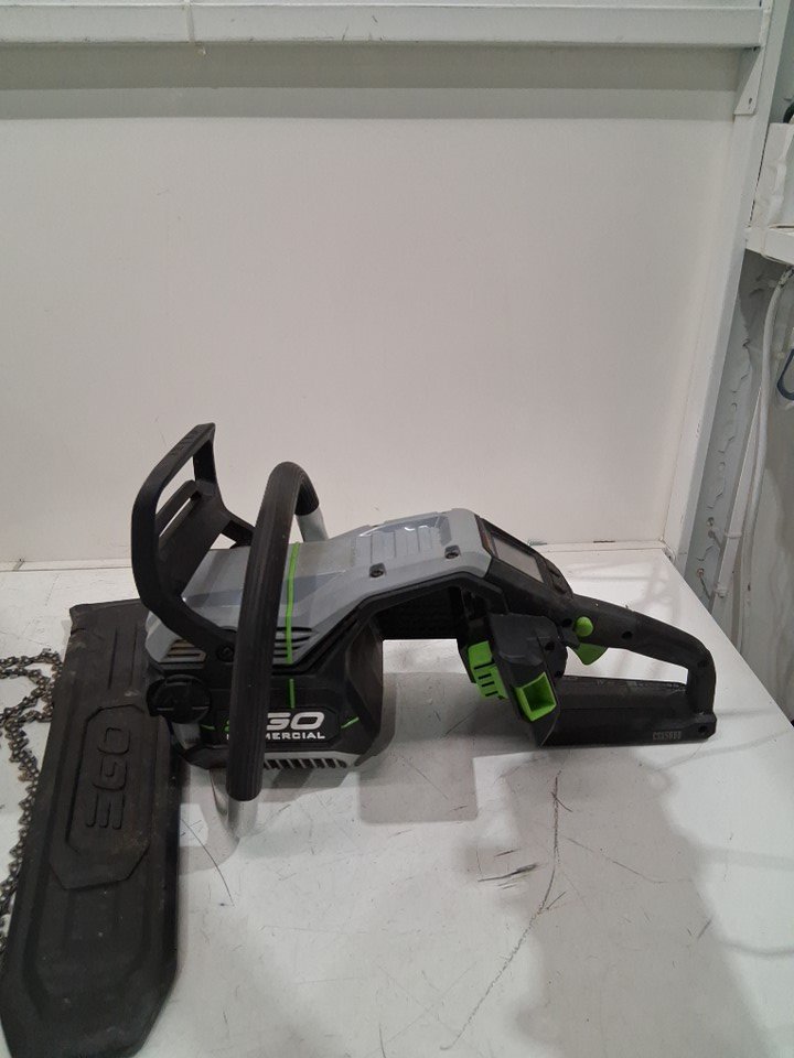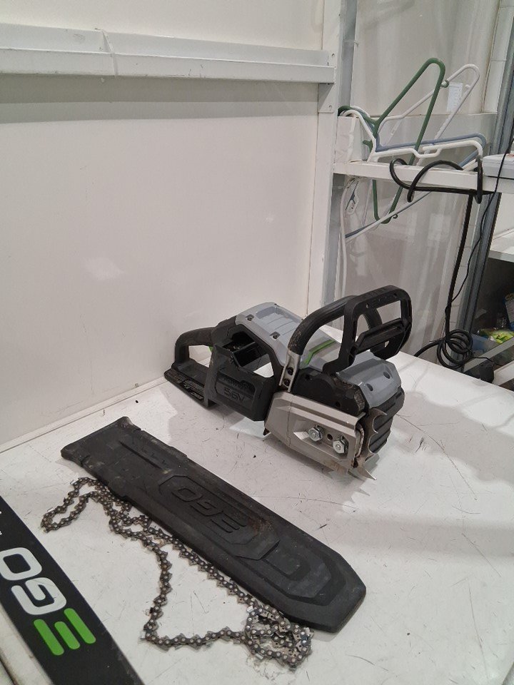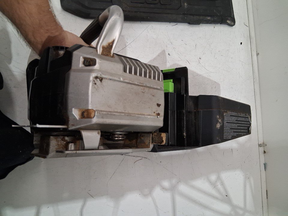 Bottom of the machine has some wood dust debris that seems to have mixed with some oil which has caked on to the machine and into some crevices. chain has a significant amount of oil as well. Blade which holds the chain has been removed and may need to be put back on machine.