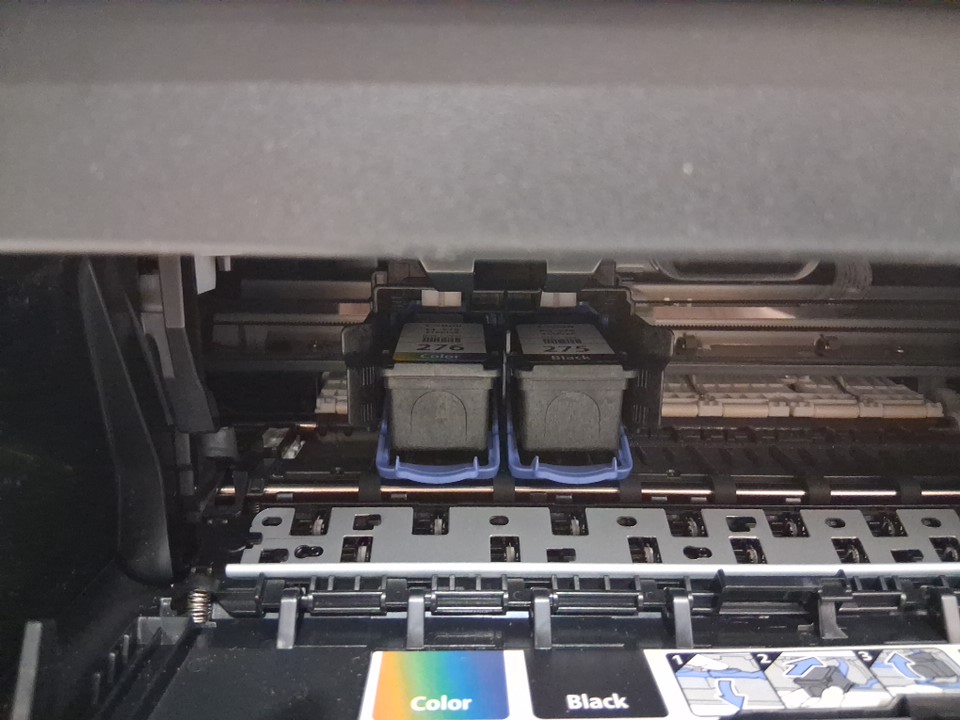 Printer ink cartridges are already in printer, unable to determine ink levels, printer has visible finger smudges on them. Has been tested for power only