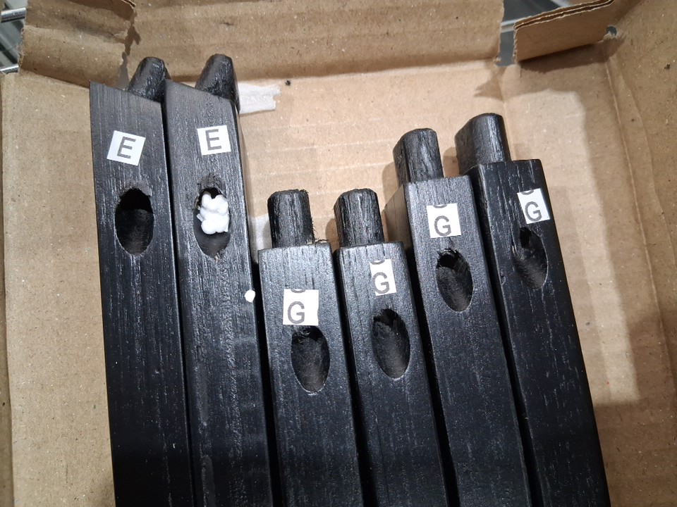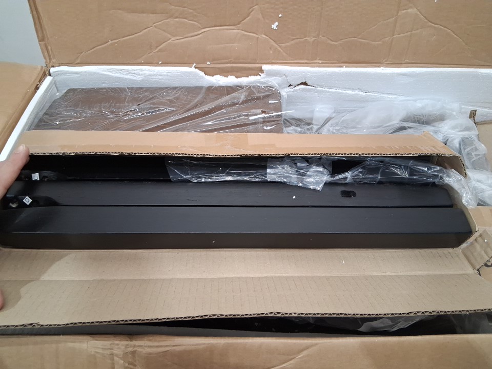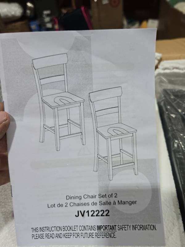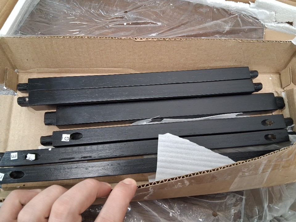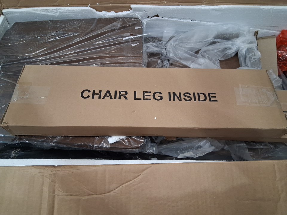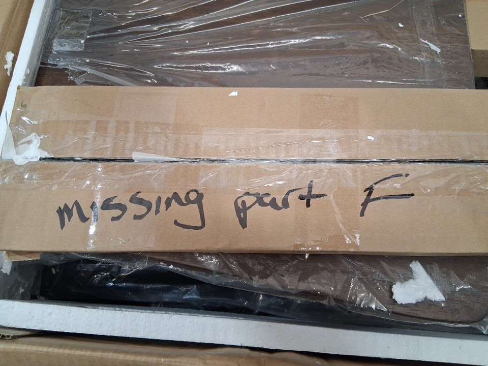 Part "F", one of the footrests, appears to be missing from the packaging -see photos. This should not prevent the chair from being built or affect structural stability. Outside of this missing part, all parts appear present and in new condition.