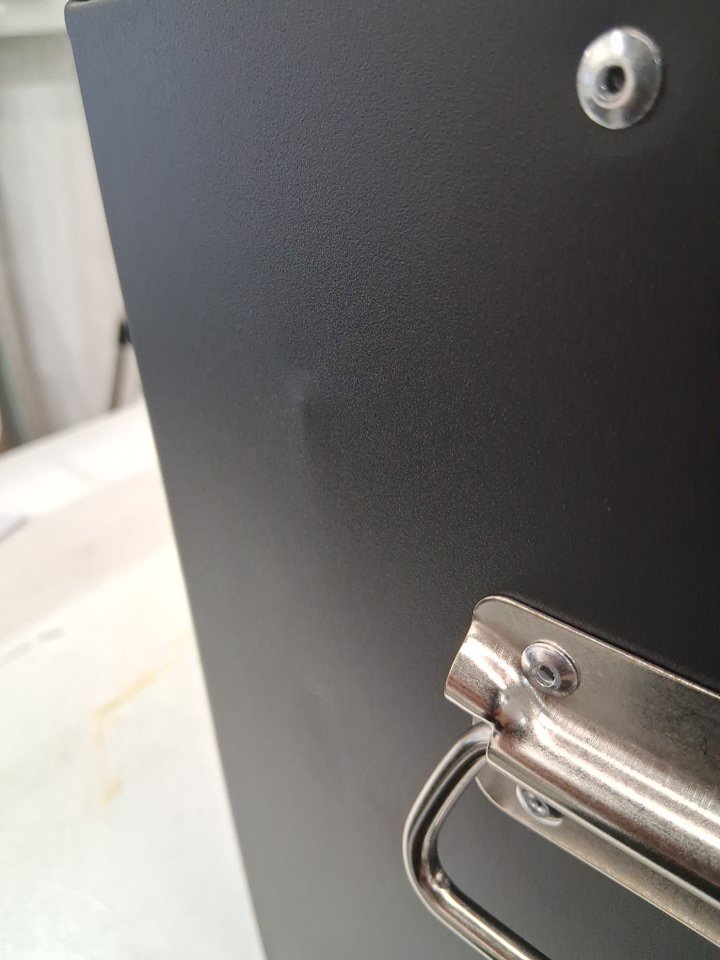 There is a small dent in the left side of the box, near the handle - see photos. Outside of this cosmetic damage, the toolbox appears to be in new condition.