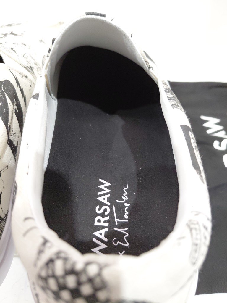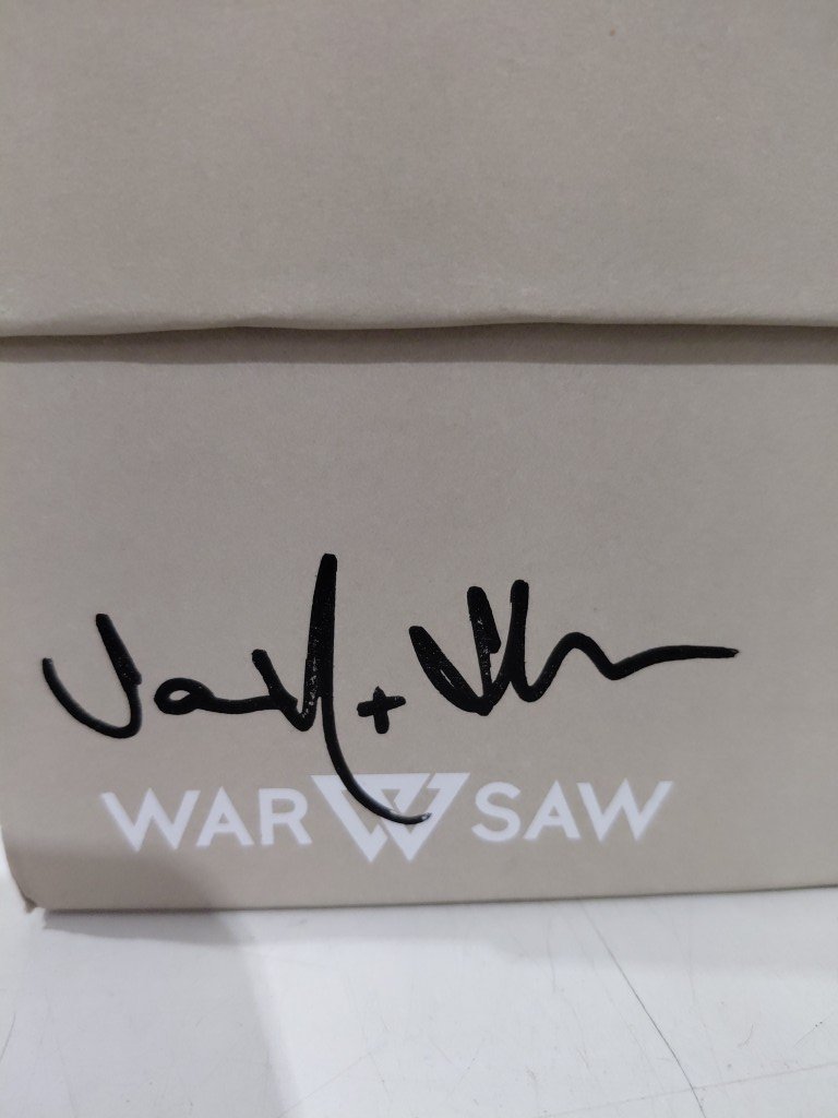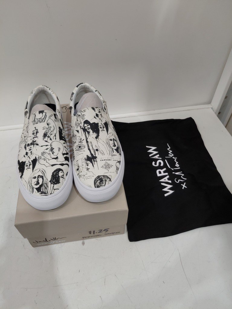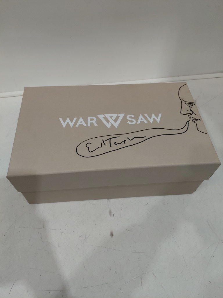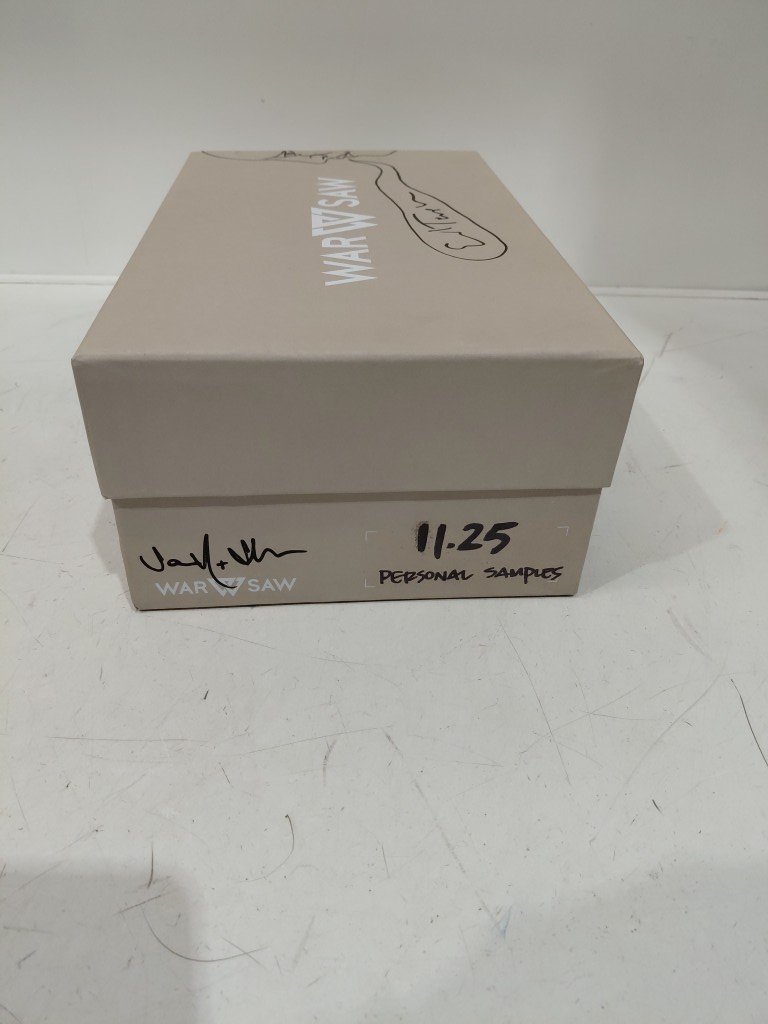 Cannot authenticate signature on box, we believe this is official. These shoes are a sample so they do not have a size provided on shoes, from measurements we found they are men's 14 (see photos)