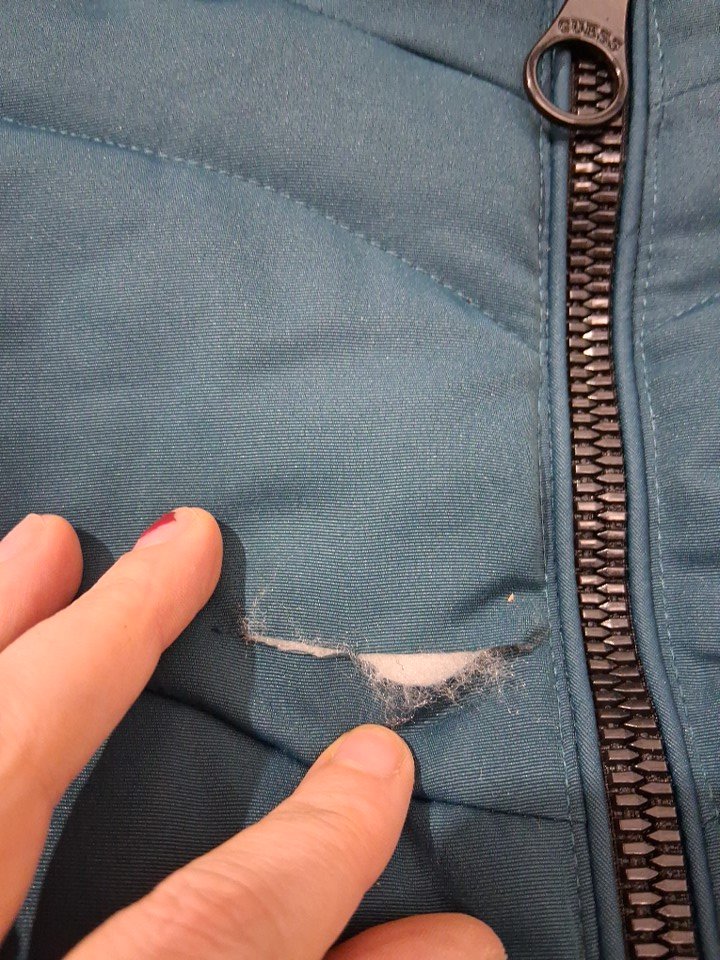 small cut on top right side of jacket by zipper.
