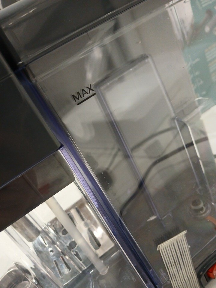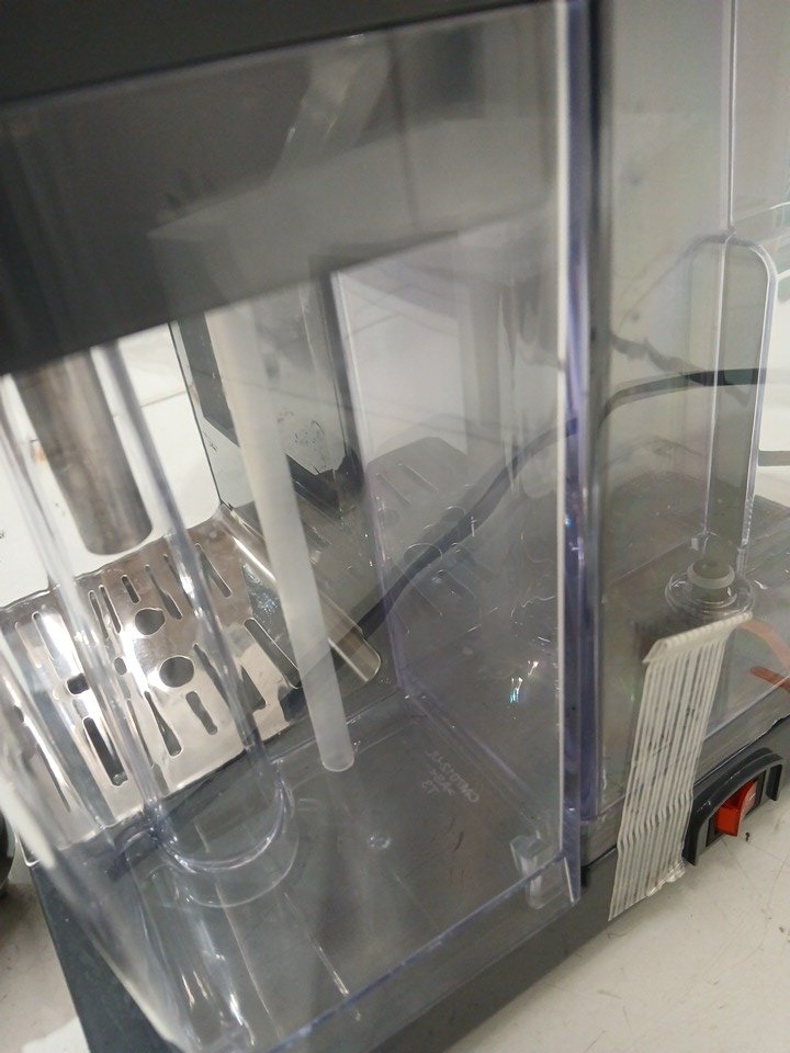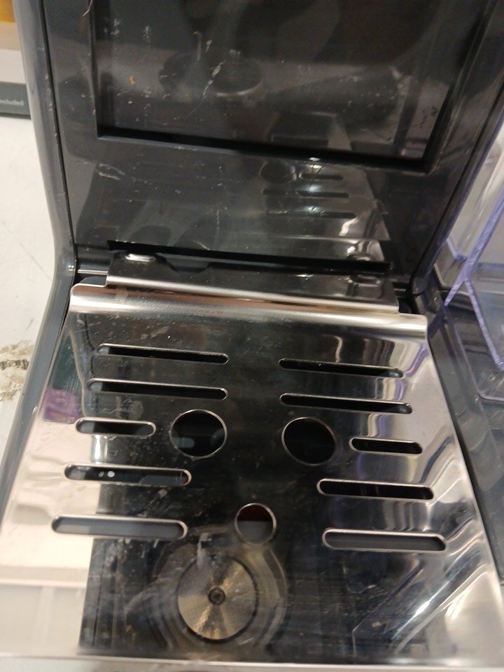 Has some water drops in the tank from use as well as in the drip tray. tested for power. Some water leaked out of the bottom.