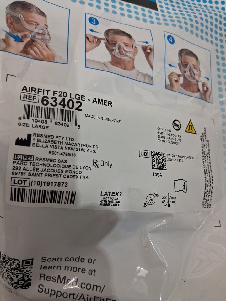 RESMED AirFit F20 Full Face CPAP Mask - LARGE - GREY (MODEL: 63402)