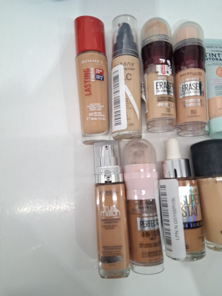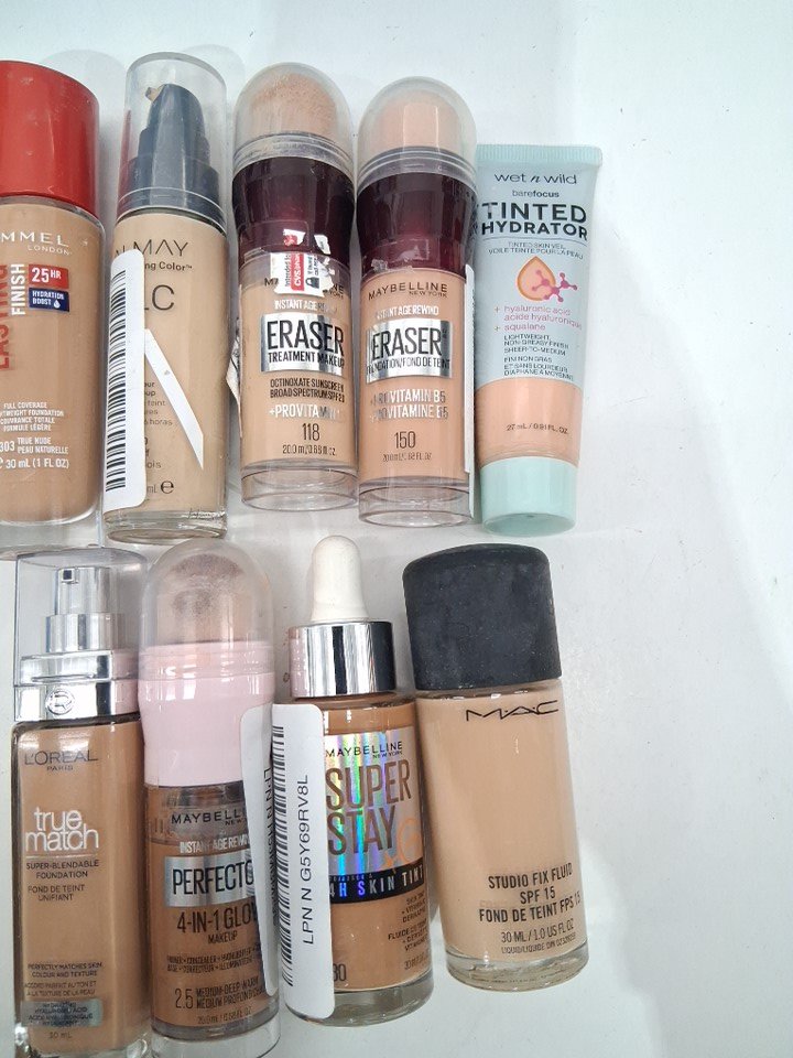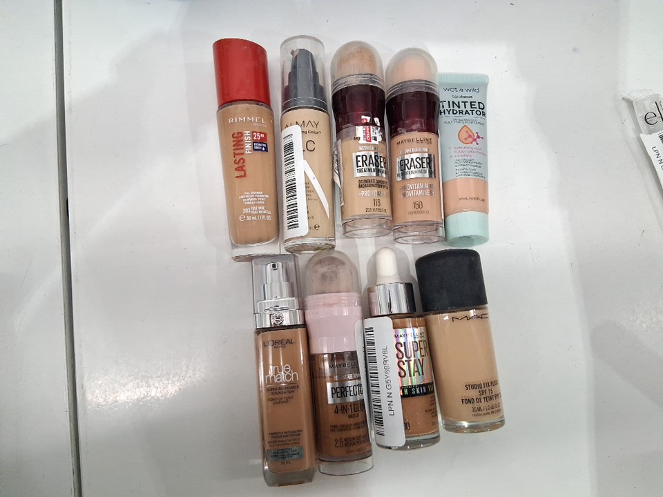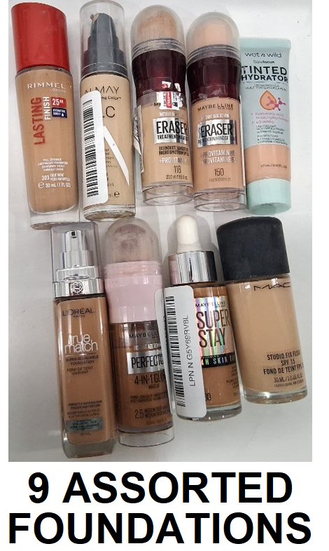 9 assorted liquid foundation makeup products - assorted brands, shades and types - rimmel / almay / maybelline / wet n' wild / l'oreal / m.a.c.