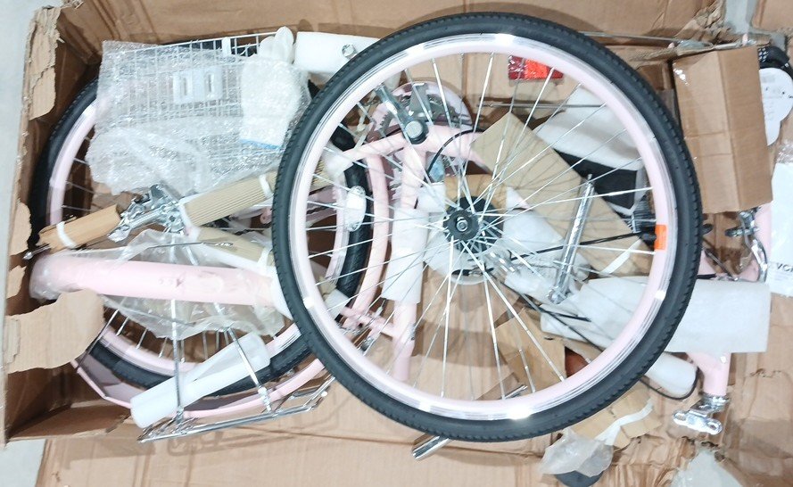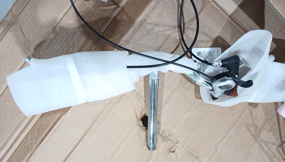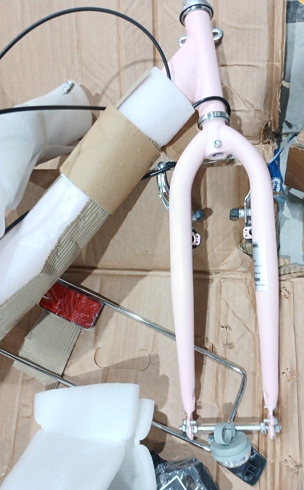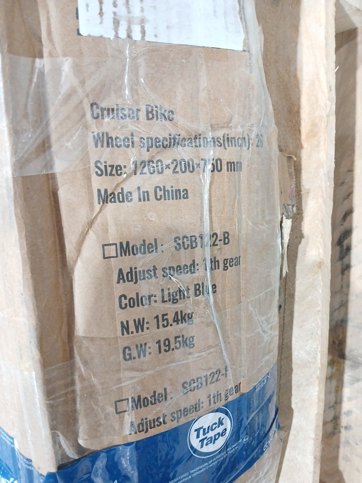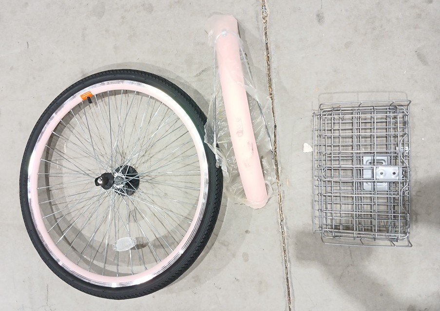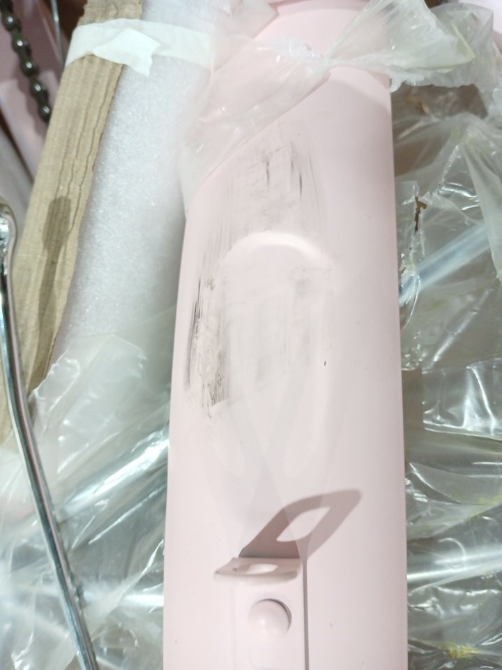The piece that cover the back wheel has a scuff, the item has minor scuffs, and the end of the handlebar has a minor slit.