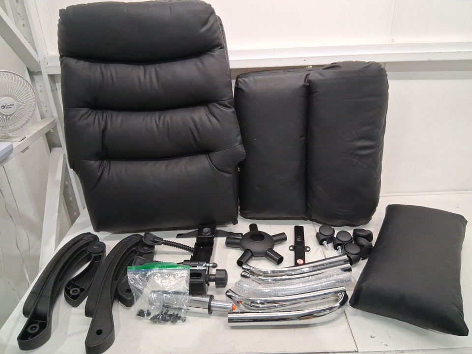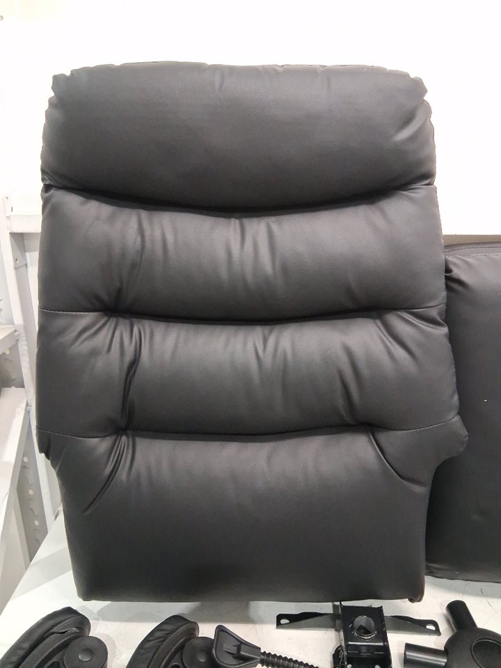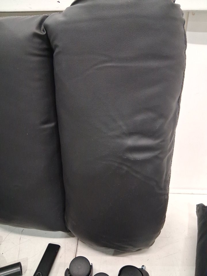 Please note: • The seat shows signs of previous use with dusting and wear marks on the seats, see photos. • The footrest piece is missing. • One of the arms has a crack in it, see photos. • The box had loose screws that were collected and bagged but additional screws/hardware will be required for installation.