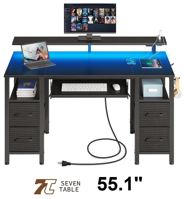 Seventable 4 Drawers Computer Desk with LED Lights, Power Outlets, & Keyboard Tray- 55.1" black (model: cpt041-v3n-bk140-st)