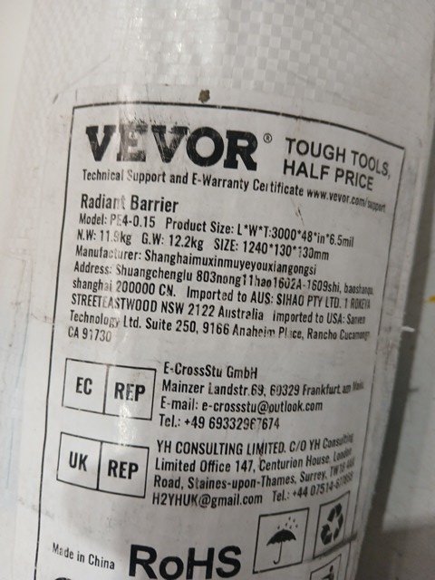 Vevor Double reflective insulated radiant barrier - 4ft x 25ft - silver - (Model: PE4-0.15)