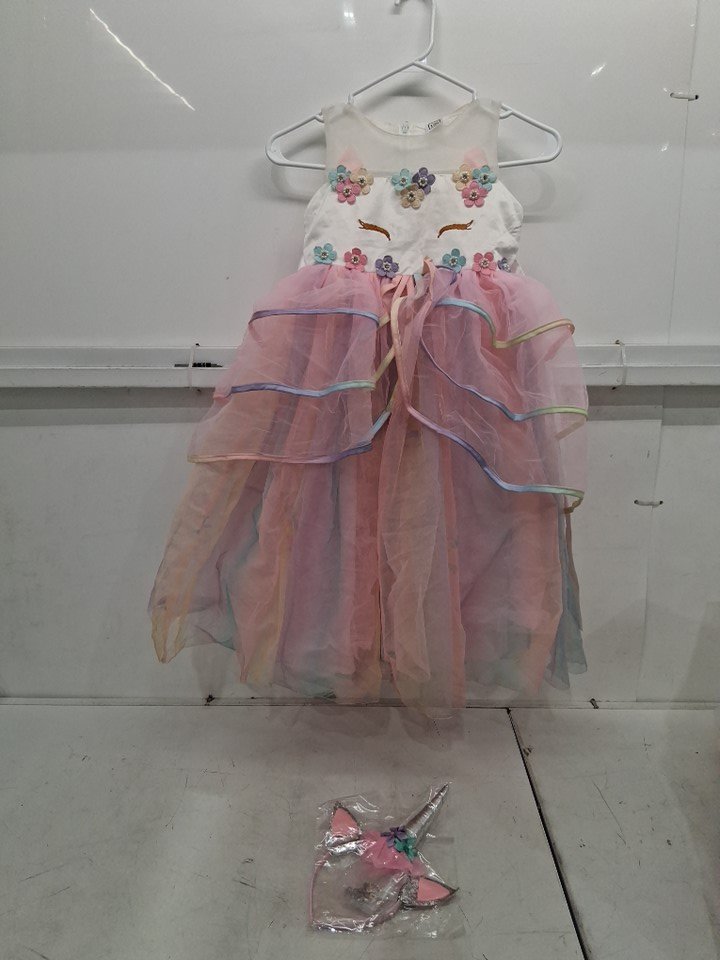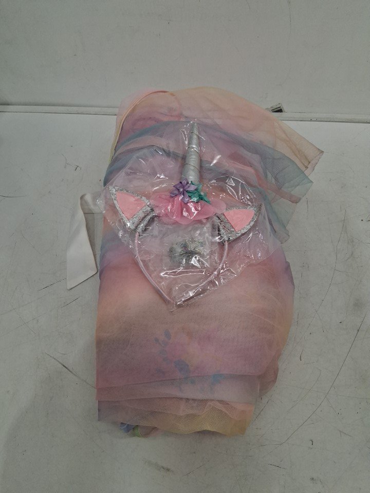 3PC GIRLS RAINBOW UNICORN TULLE PRINCESS DRESS WITH UNICORN HORN, NECKLACE AND RING - 4-5 YEARS OLD