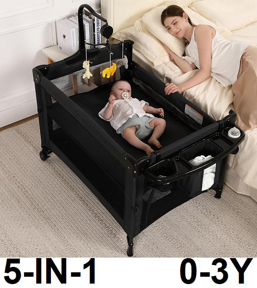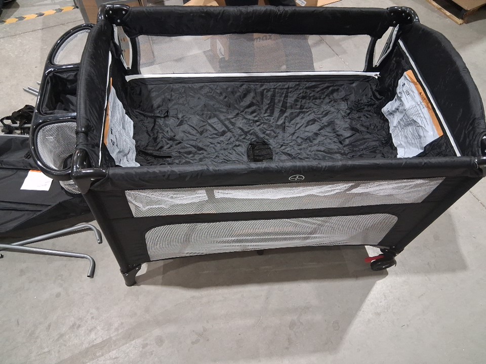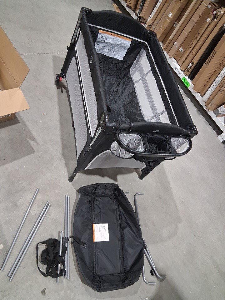 dirt on the items wheels/ entirety of the item, the hanging mobile is missing.