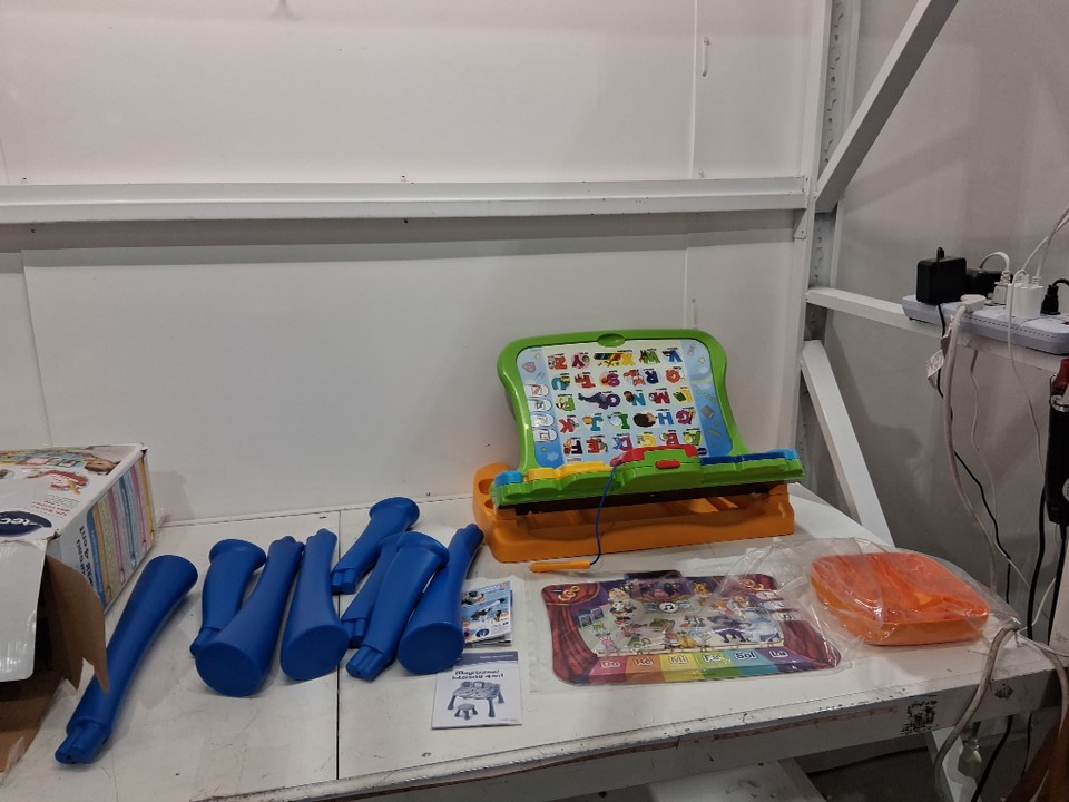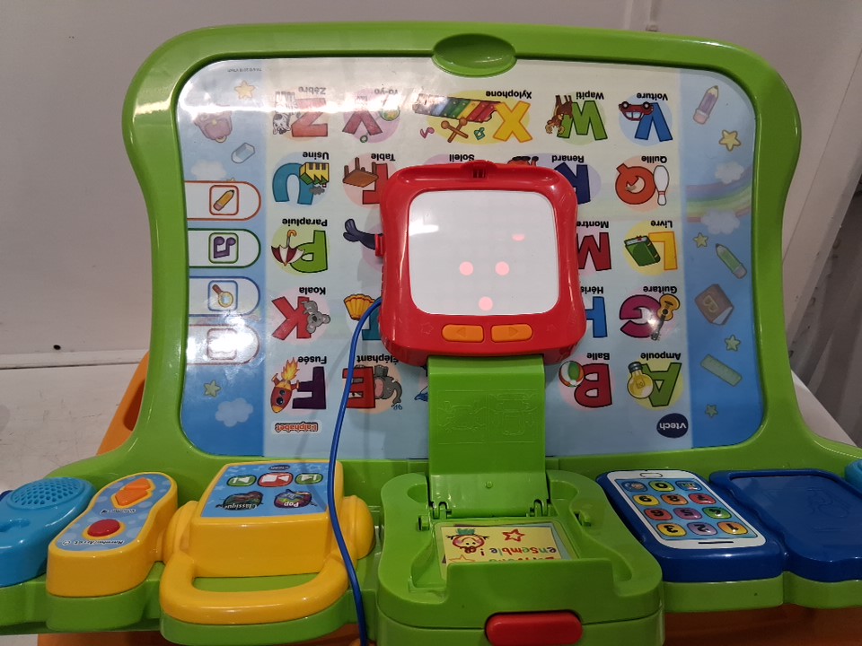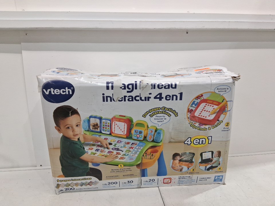 *french edition* vtech interactive 4-in-1 magic back to school learning desk with stool, chalkboard, easel, writing pad & projector, ages 3-6- green/blue- (model: 80-195805)