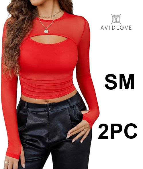 2PC womens avidlove sheer mesh long sleeve crop top cutout with thumb holes and tank top - small - red