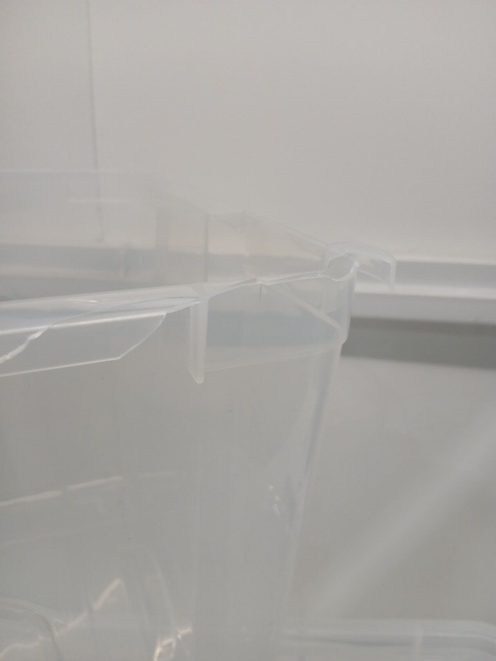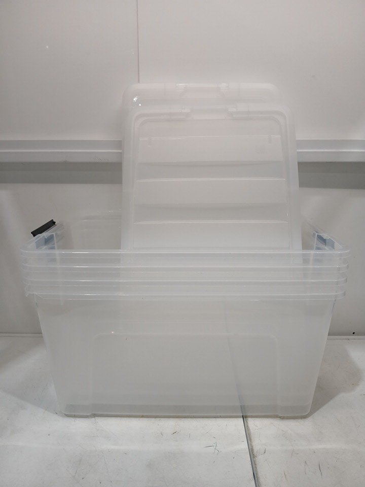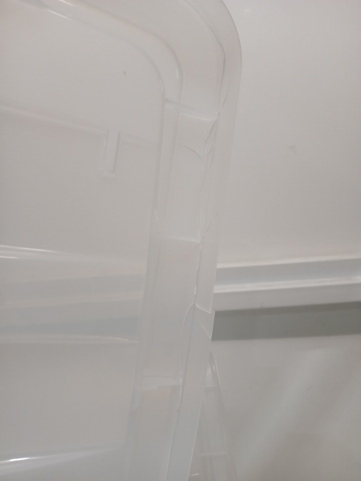 appears new, but 2 bins are cracked along the rim & all 4 lids have damage to the edges. the bins are still functional, but the lids may not lock as well