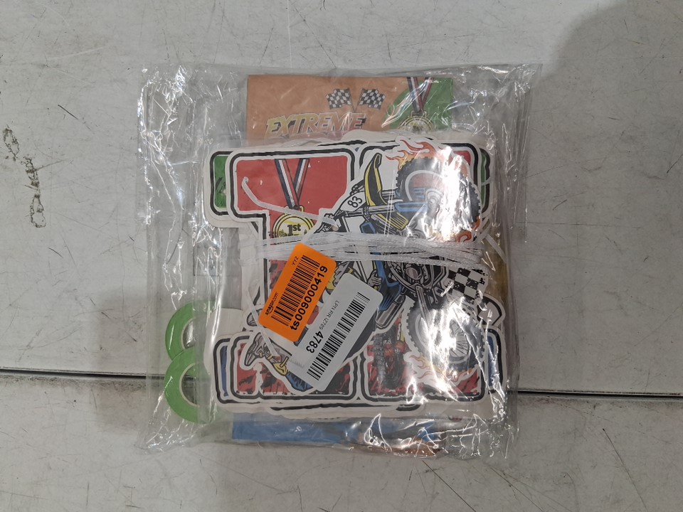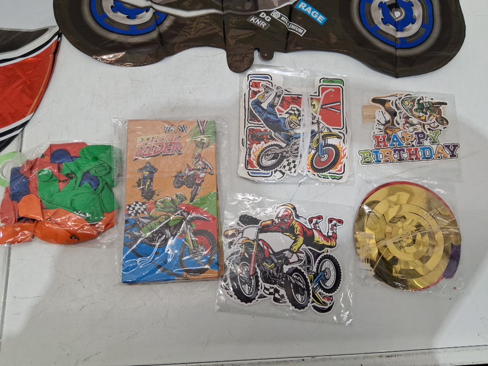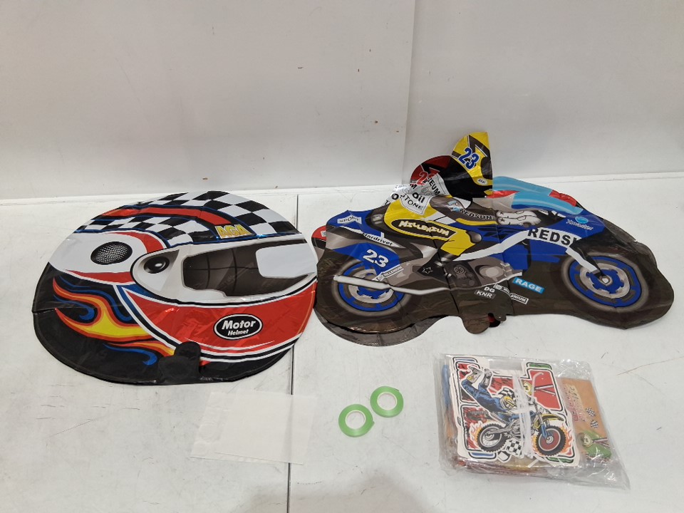 item arrived with no packaging or manual to confirm piece count. Included in the package are: 4 Large balloons, 19 small balloons, 8 party bags, 7 decals, 26 letters for happy birthday banner, 6 swirl decorations, and 11 cake toppers