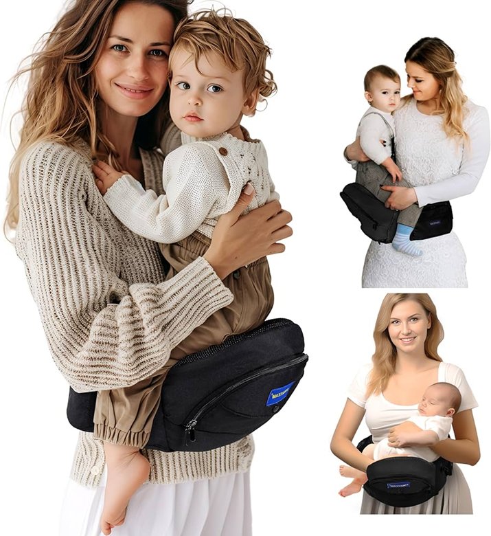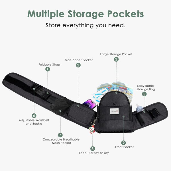 FRUITEAM Baby Hip Carrier - Ergonomic Hip Seat Adjustable Lumbar Support - Black