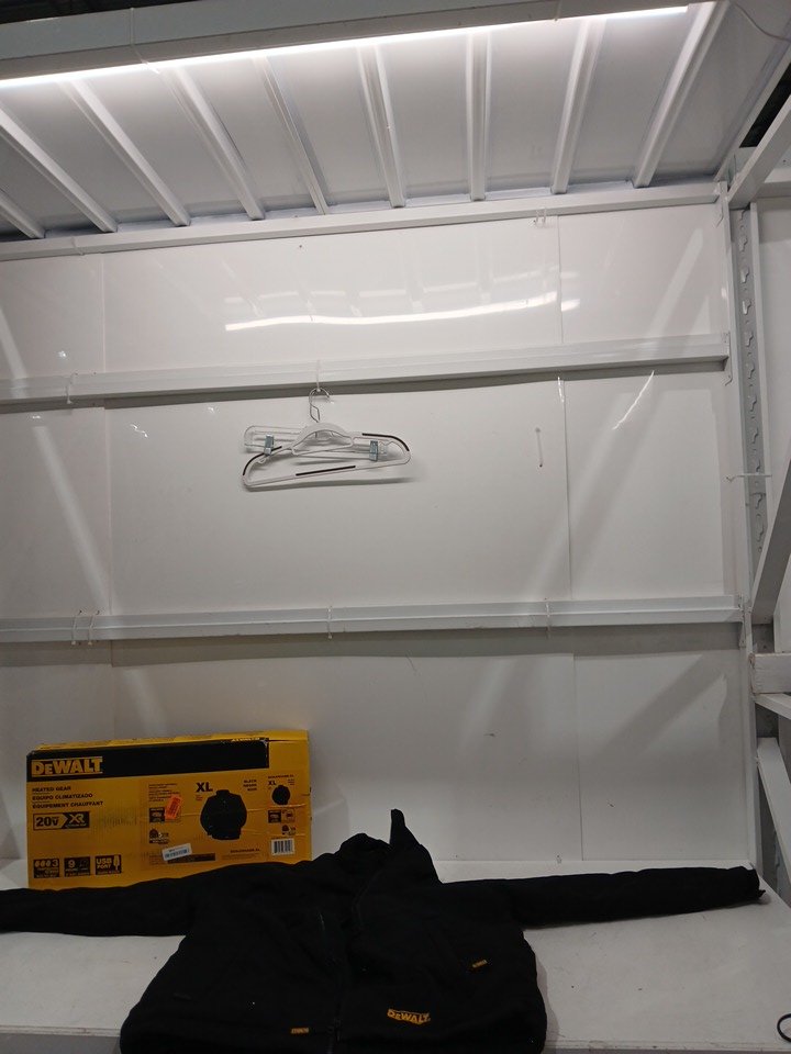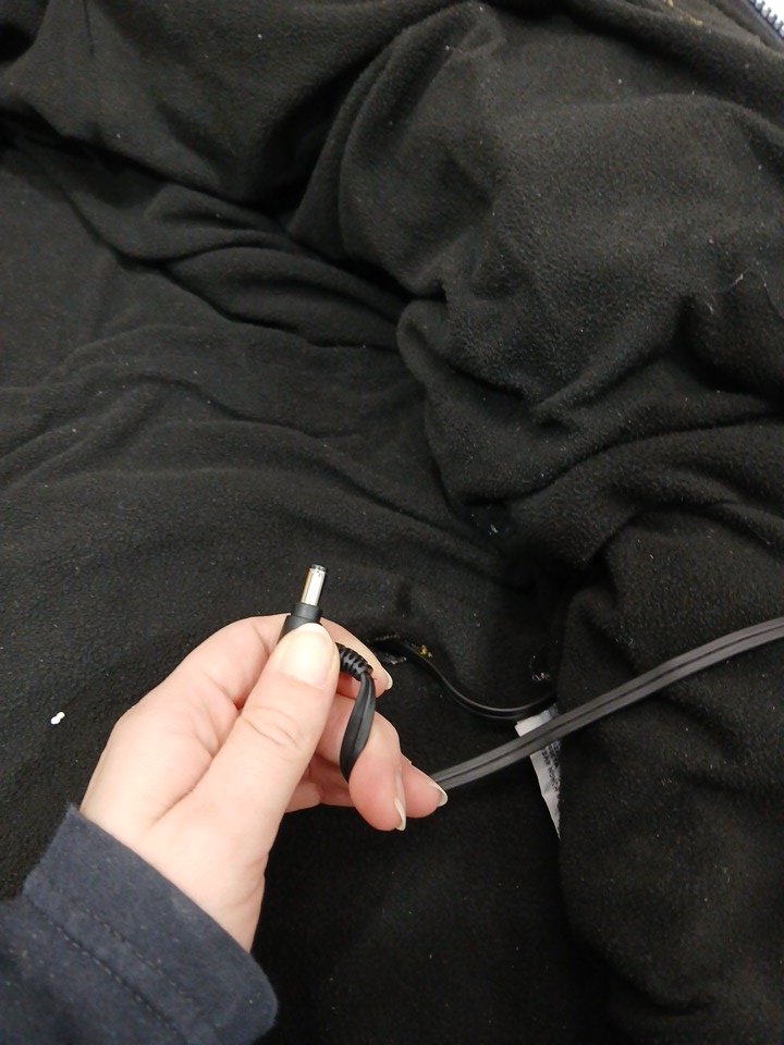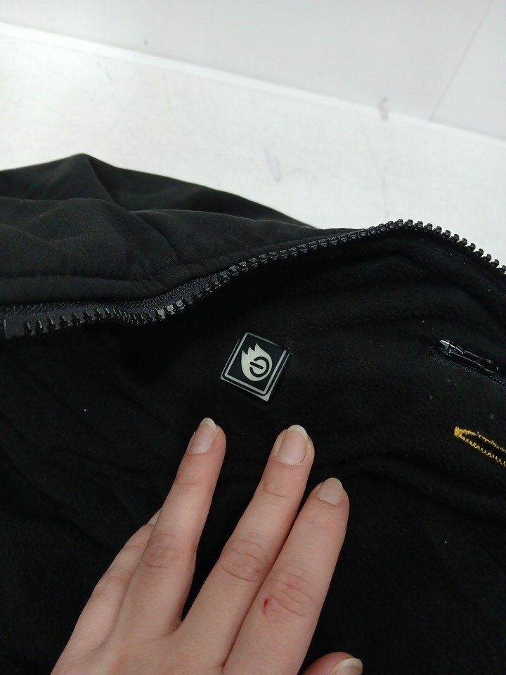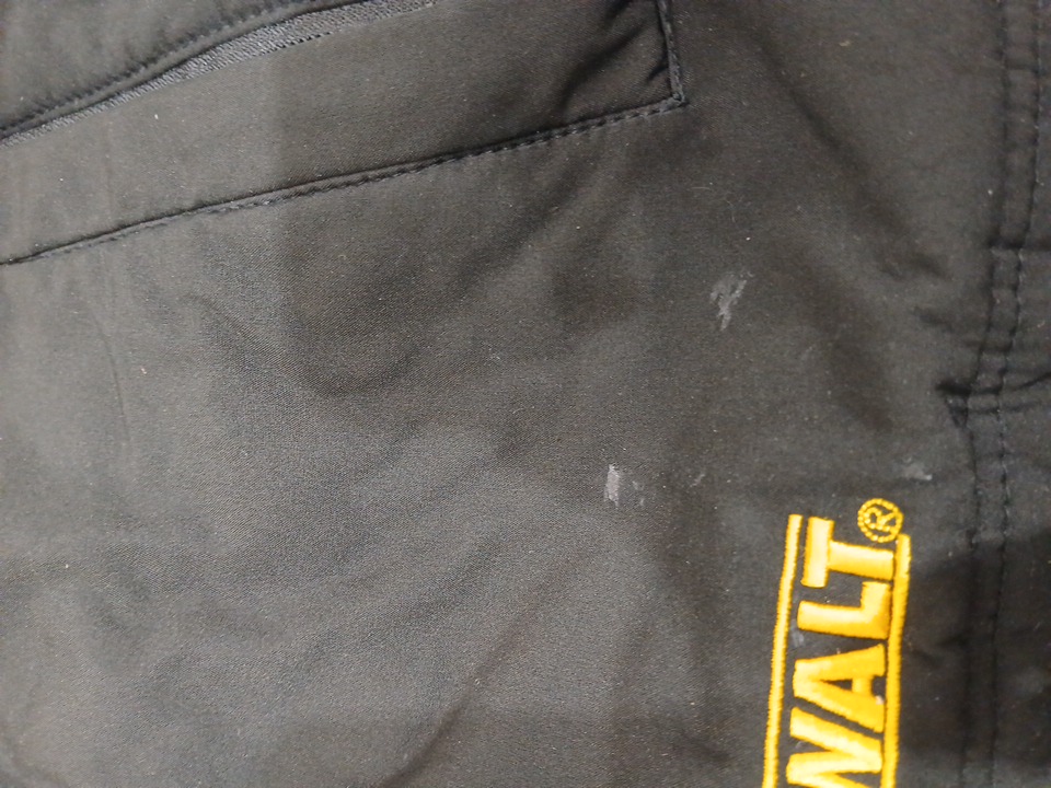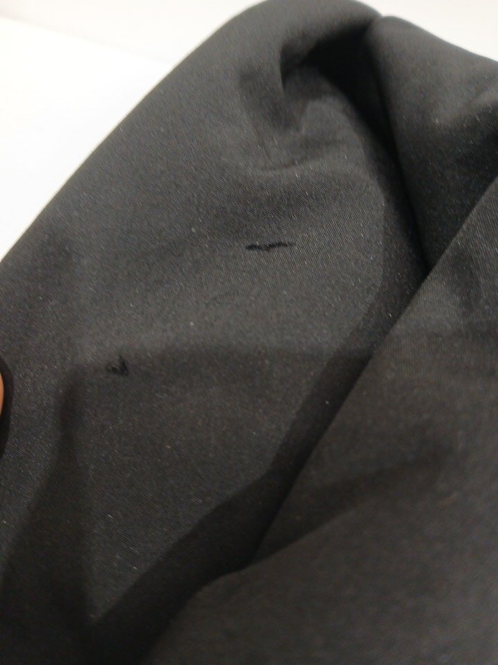 Missing adapter/charger. Has some blemishes near the bottom front of the coat. Ha some minor tears in the sleeves.
