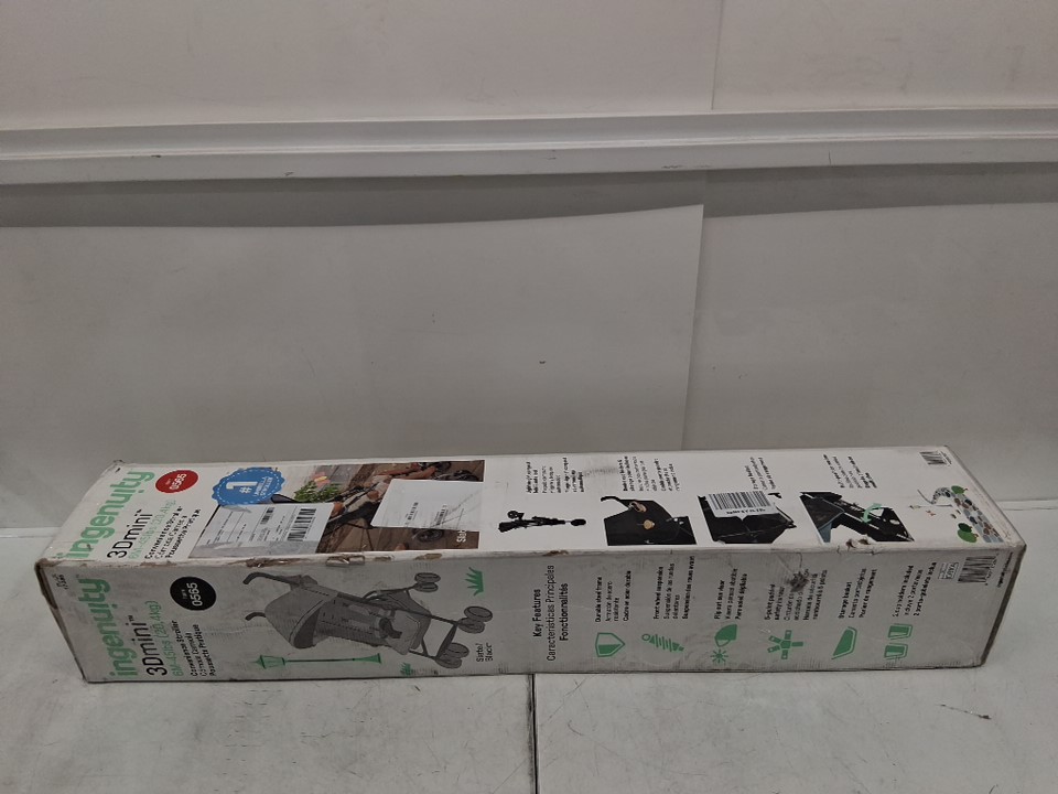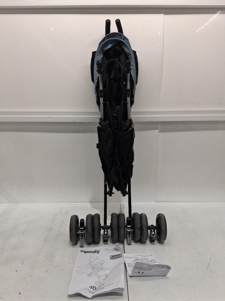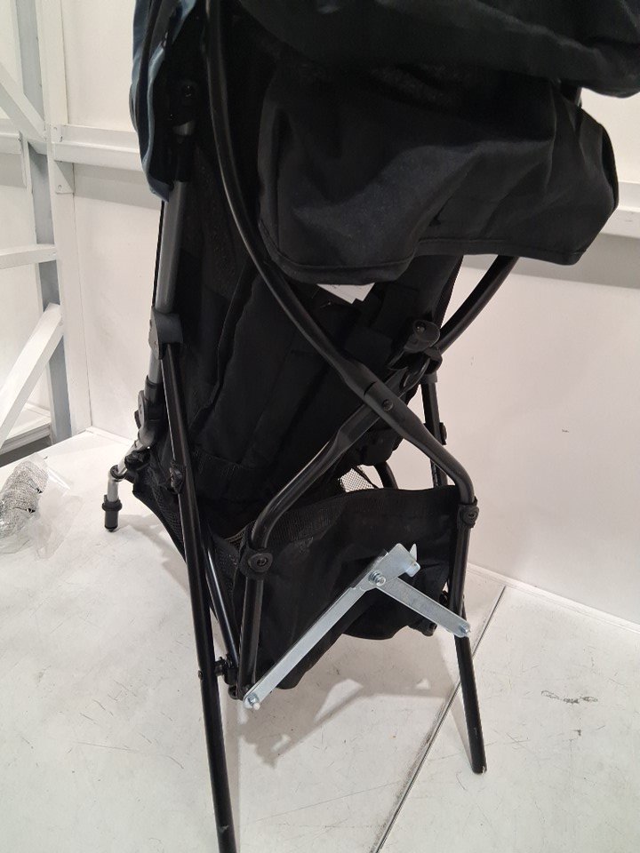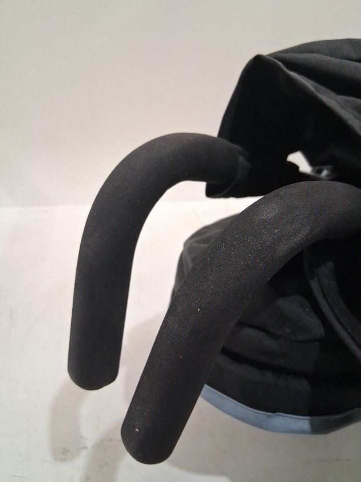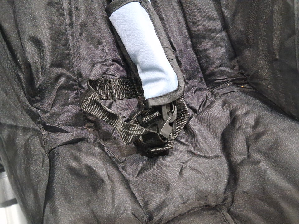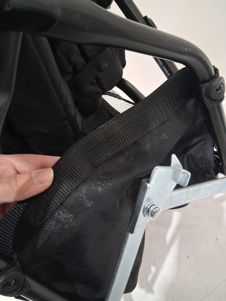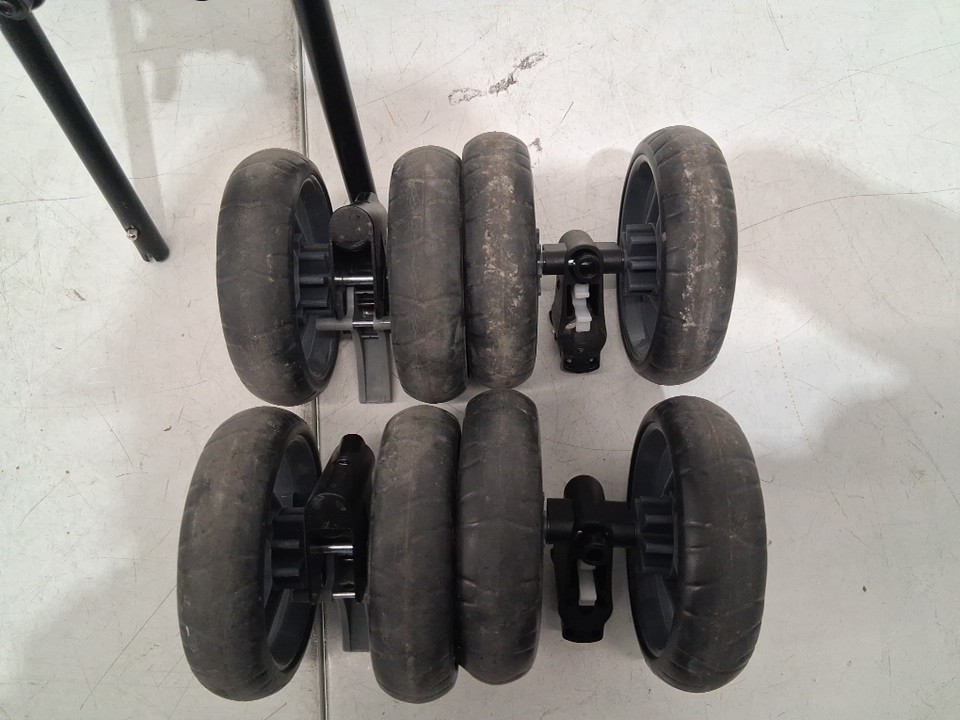 Dirty wheels, crumbs on seat and marks on handle and storage area from previous use, see photos