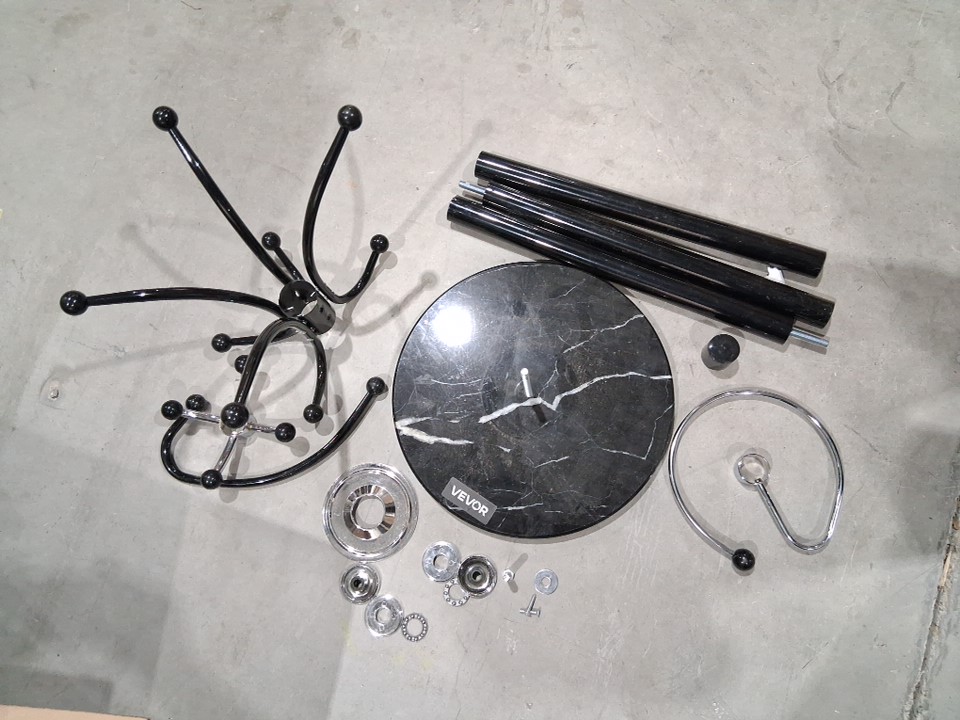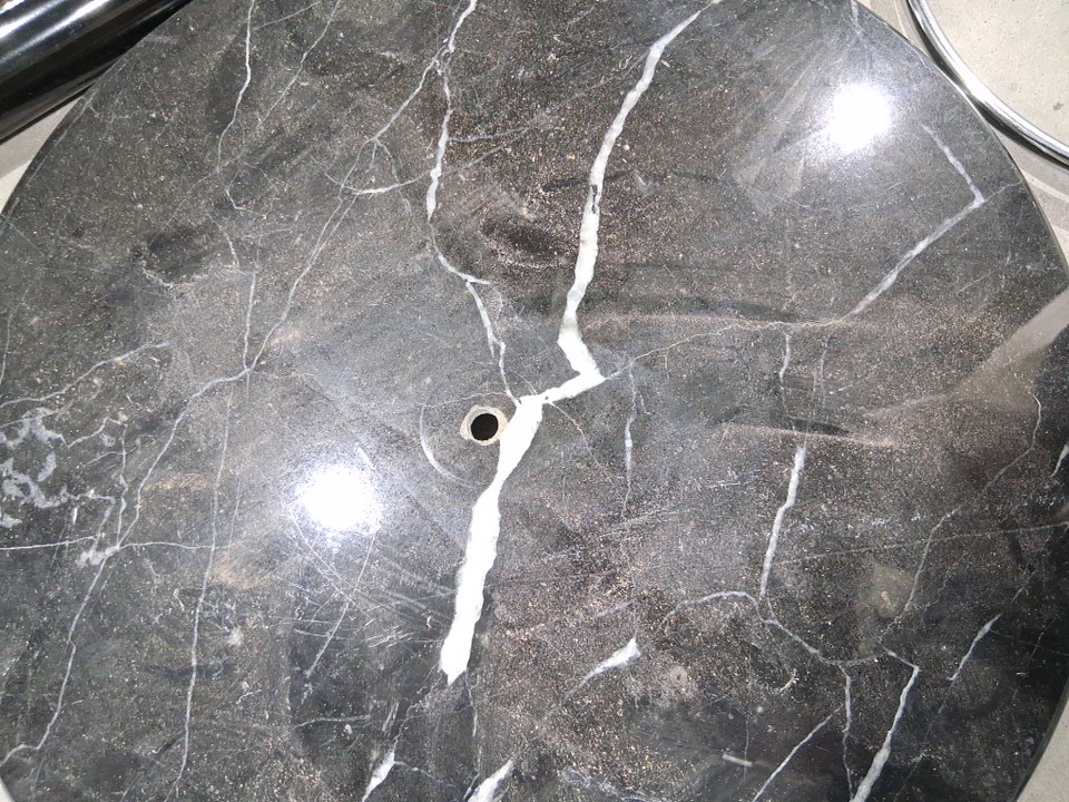 Assembly marks on the metal pieces and the marble base has a ring around the screw hole from assembly One of the 3 poles has a light bend at the end but should not affect assembly