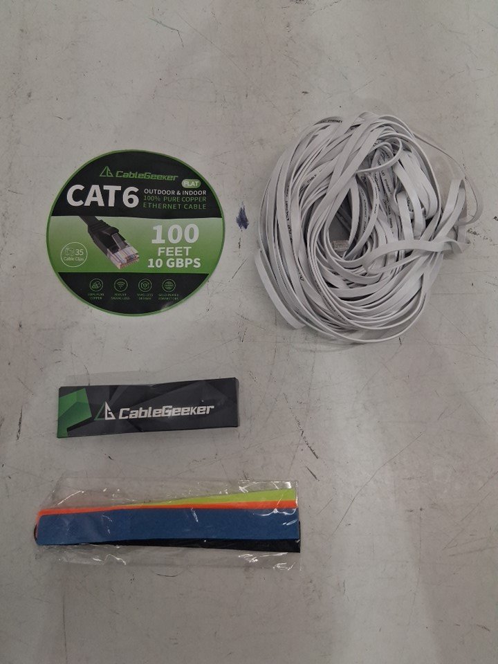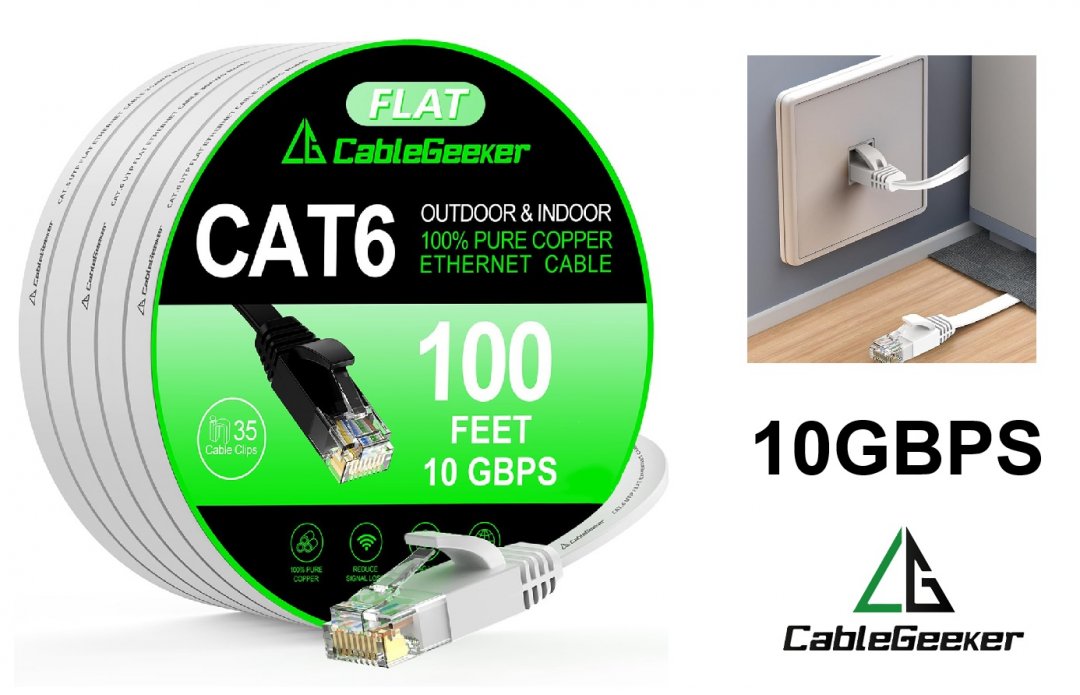 Cat 6 High Speed Indoor & Outdoor Ethernet Cable with clips and straps - 10Gbps - 100ft - White (Model: CECOMINOD055605)