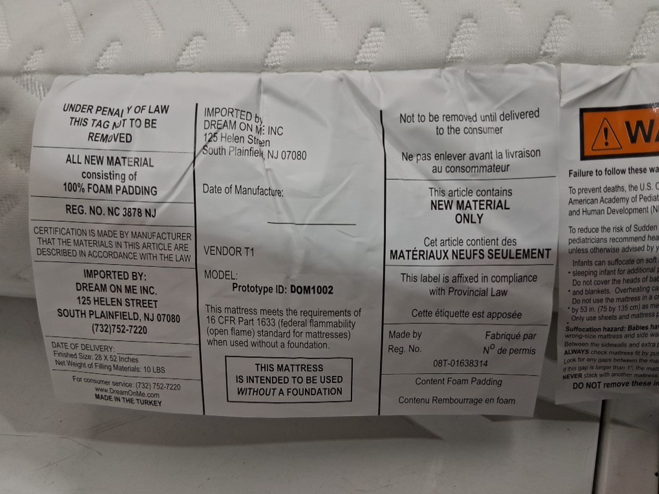 Dream On Me Baby Zzz Foam Crib And Toddler Bed Mattress - 28" x 52" x 5" - White - (Model: ‎DOM1002)