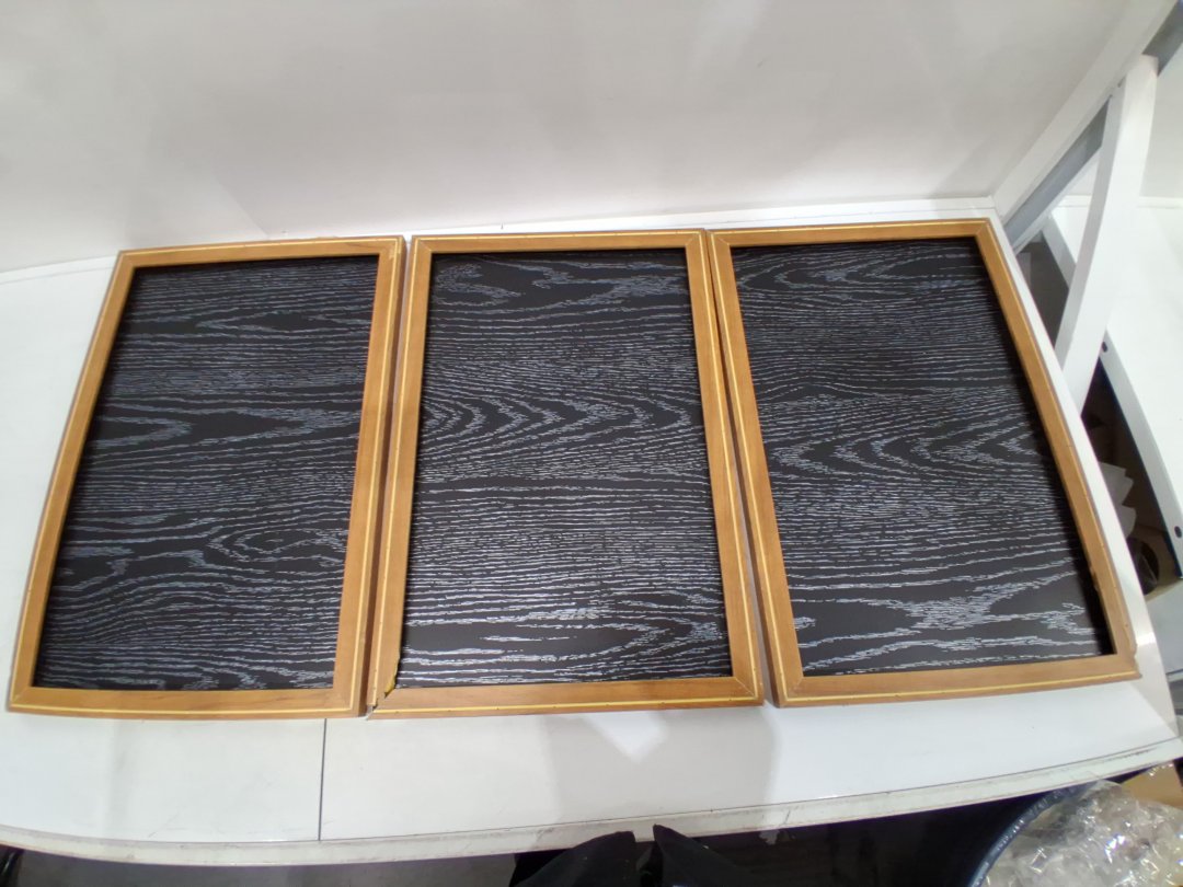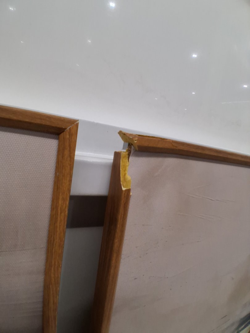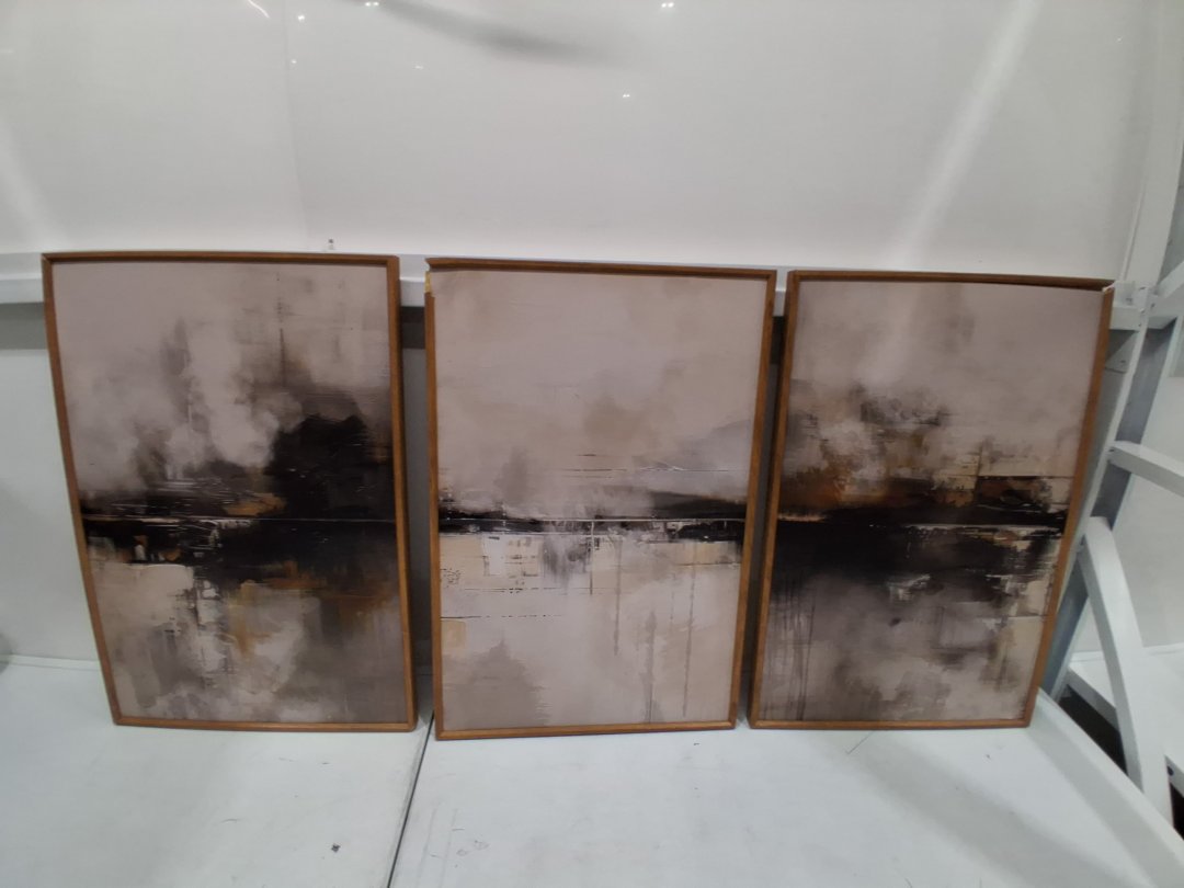 Item has damaged frames on two of the canvases. One has a small chunk missing out of the corner and the other is separating at the corner. Art can be removed from frames and used separately or reframed. The canvases themselves are intact.