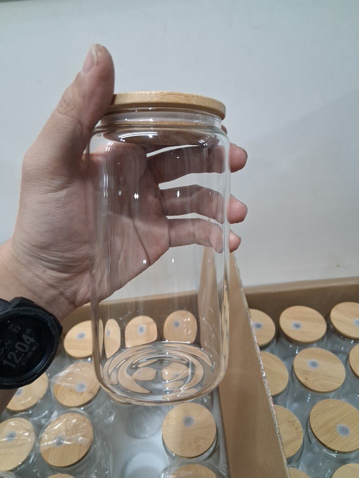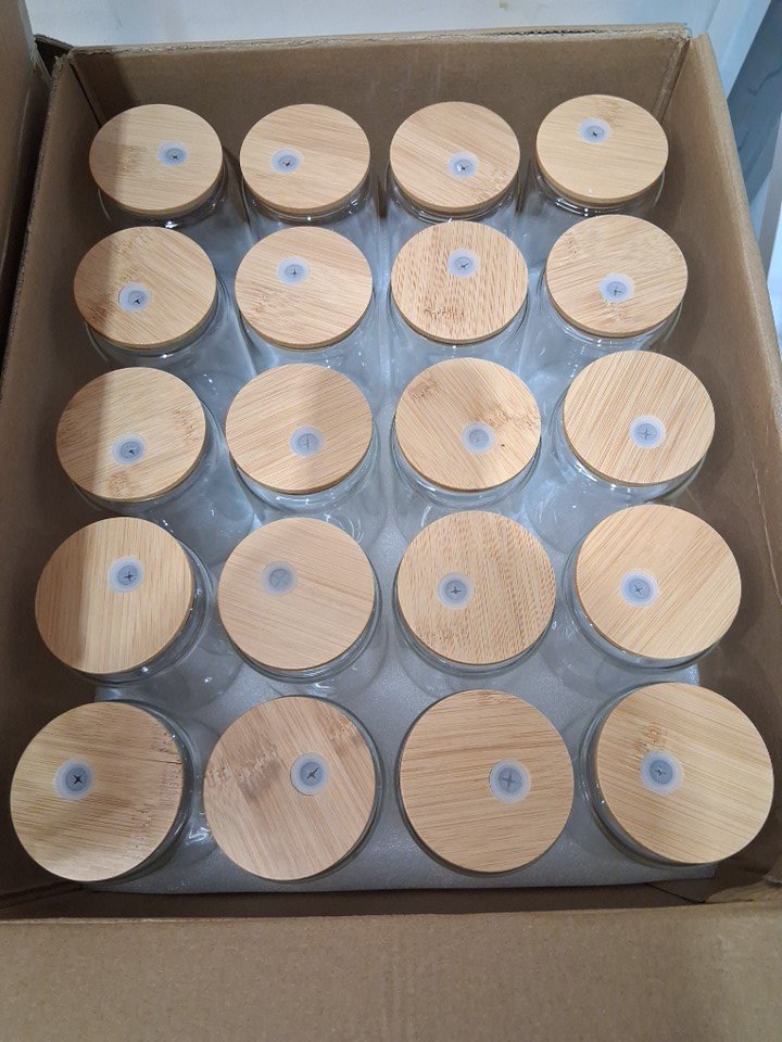 20PC glass cups with bamboo lids and straw holes - 16oz - clear
