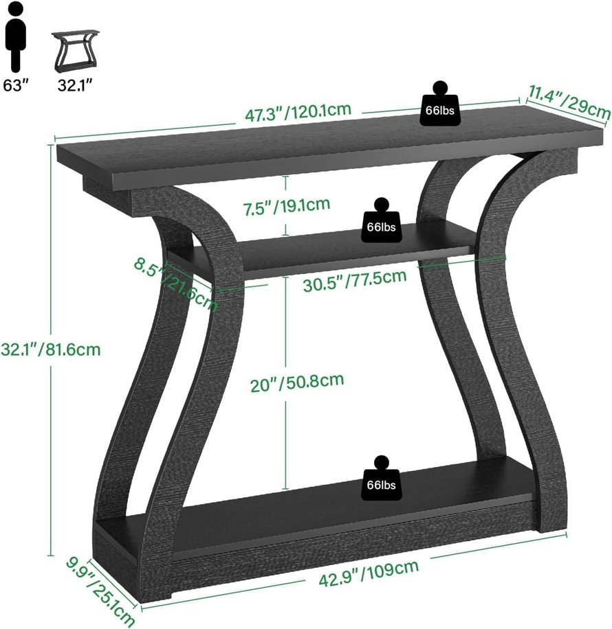 UODERS 3-tier Wooden Console Table with Curved Legs and shelves - 47" - Black - (Model: ‎CONTEB)