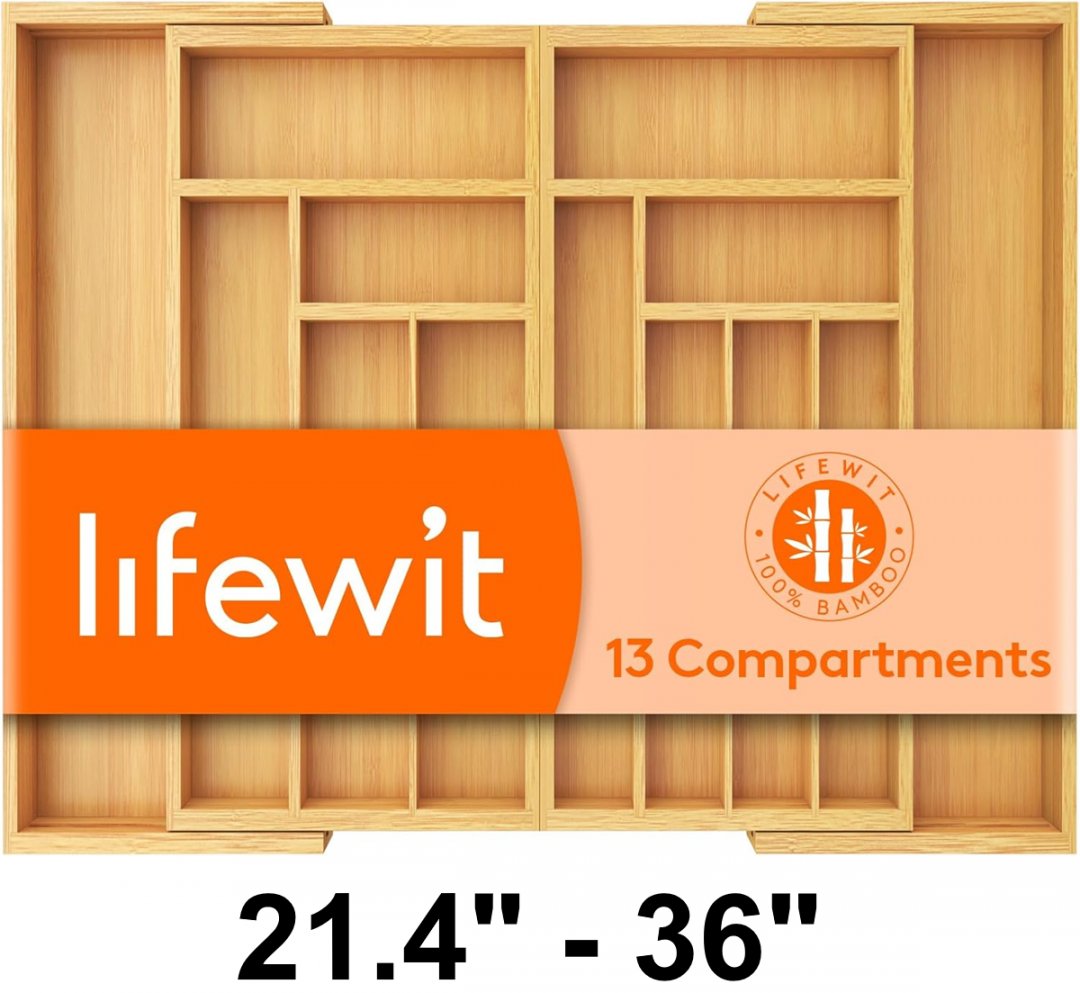 lifewit 13 compartment expandable cutlery/silverware holder - 21.4" to 36" - bamboo