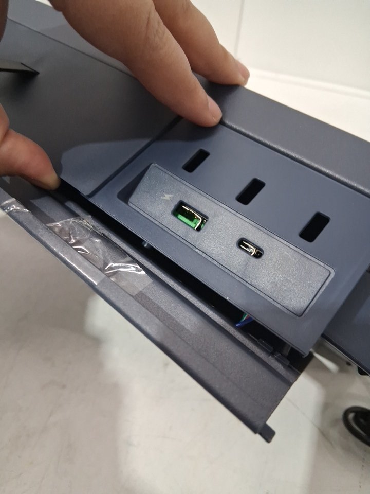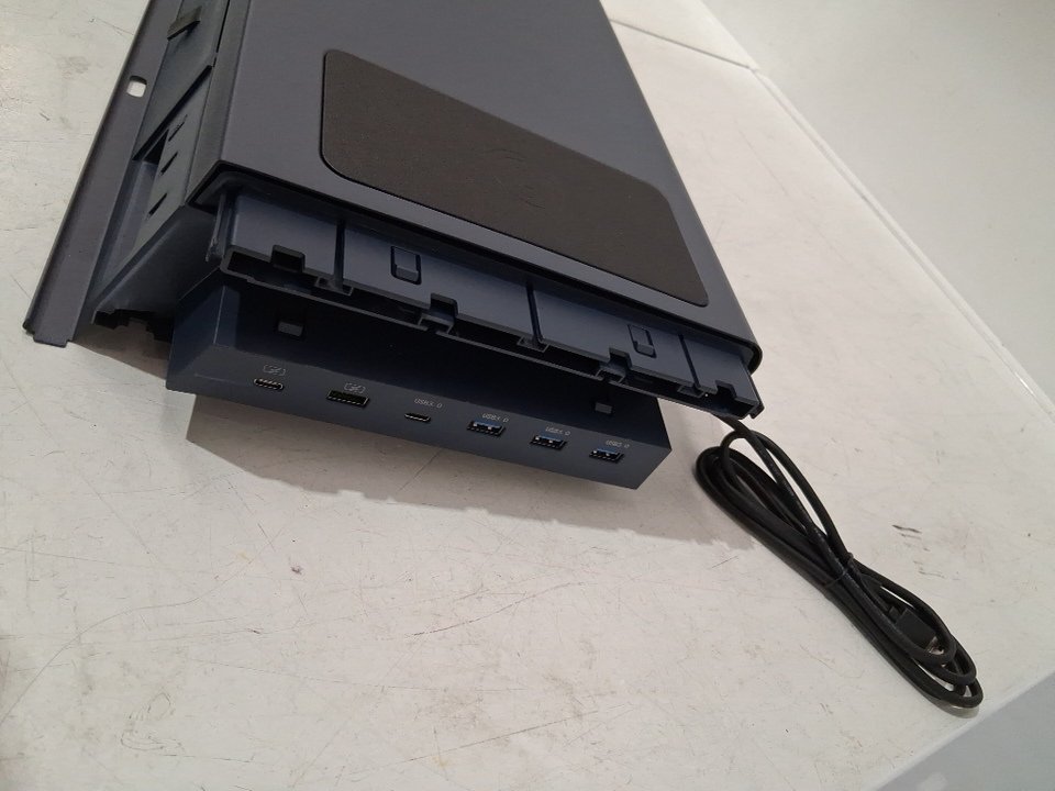 monitor Riser appears to be damaged on the area where the ports are. Looks to be pushed in. some plastic clips where the screw go in have been damaged. Attempted to repair in house but unable should be able to be repaired with full disassembly.