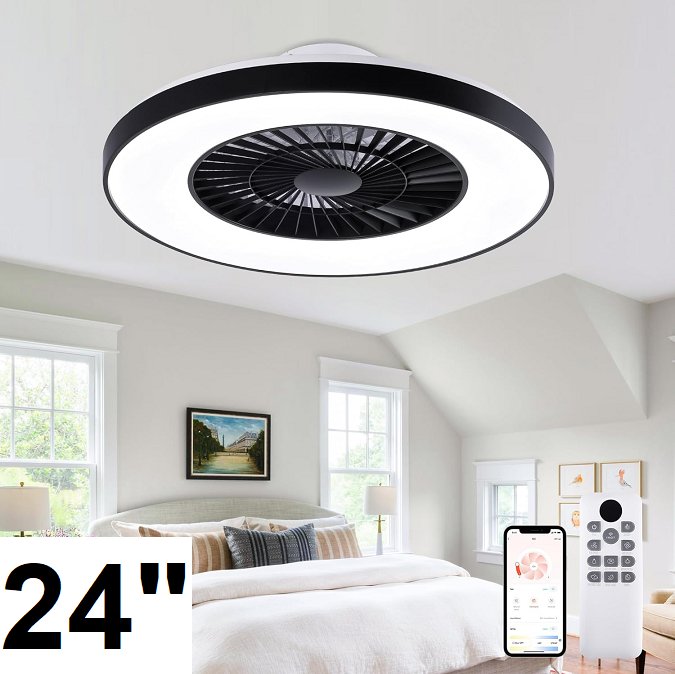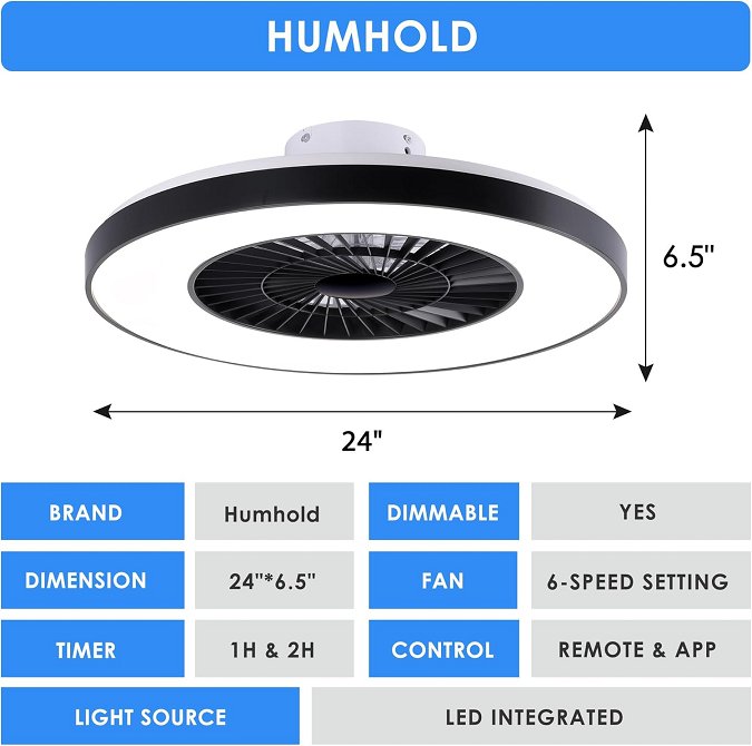 humhold 24" Low Profile Ceiling Fan with Light 3-Dimmable Lights and 6-Speeds, Enclosed Bladeless Ceiling Fan - 24" - Black (Model: b286-hdfsd-L03-bk)