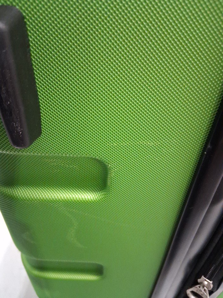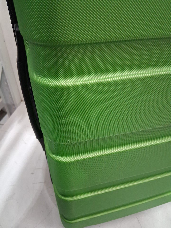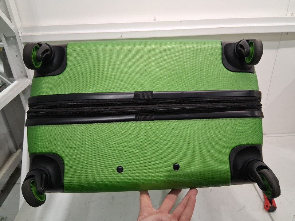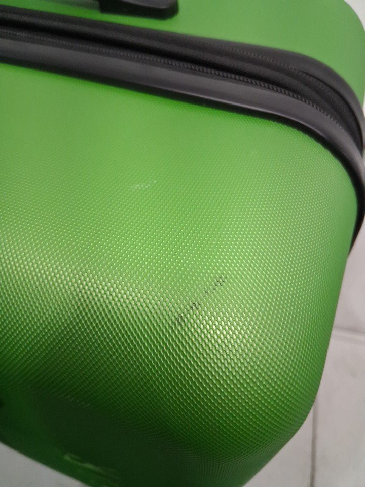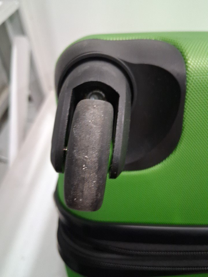 The suitcase has some scuff marks and scratches on it, and the wheels also show signs of previous use.