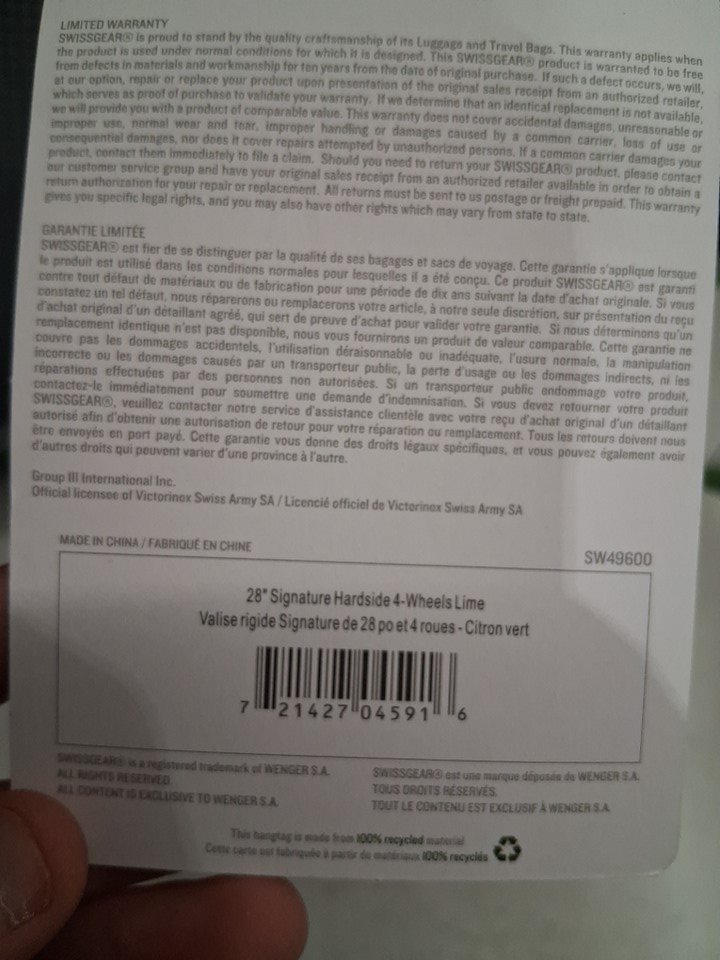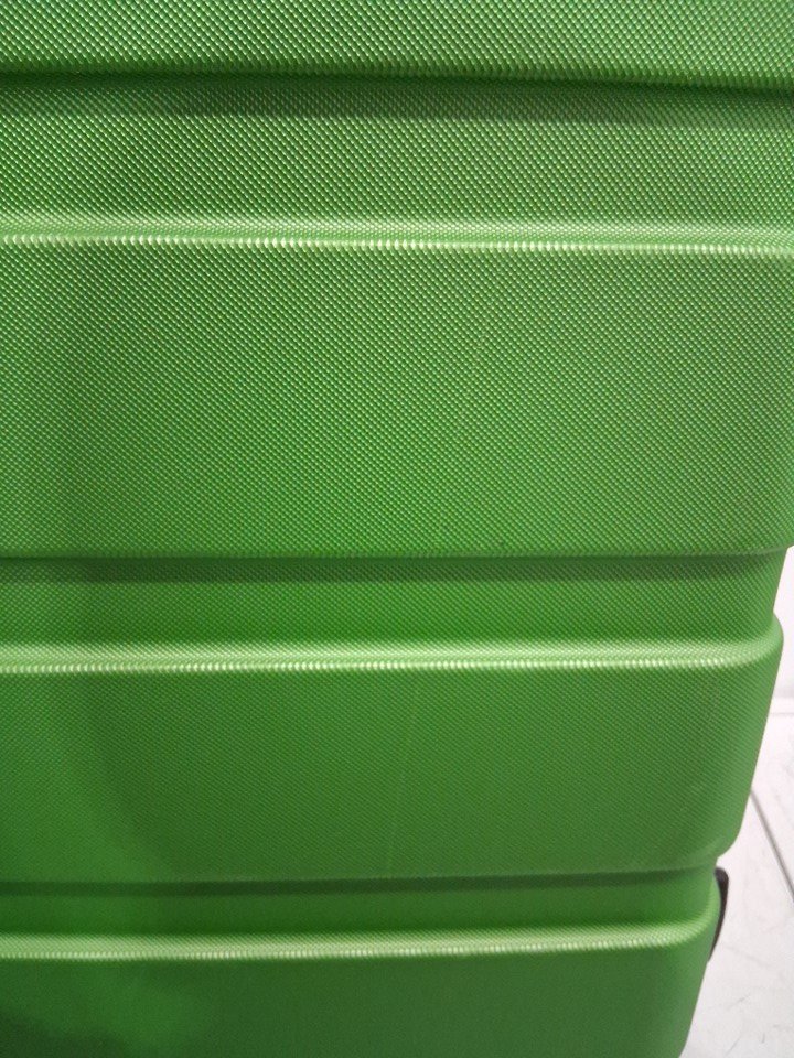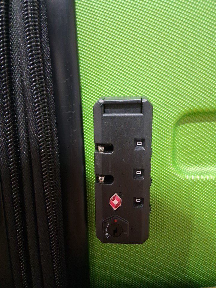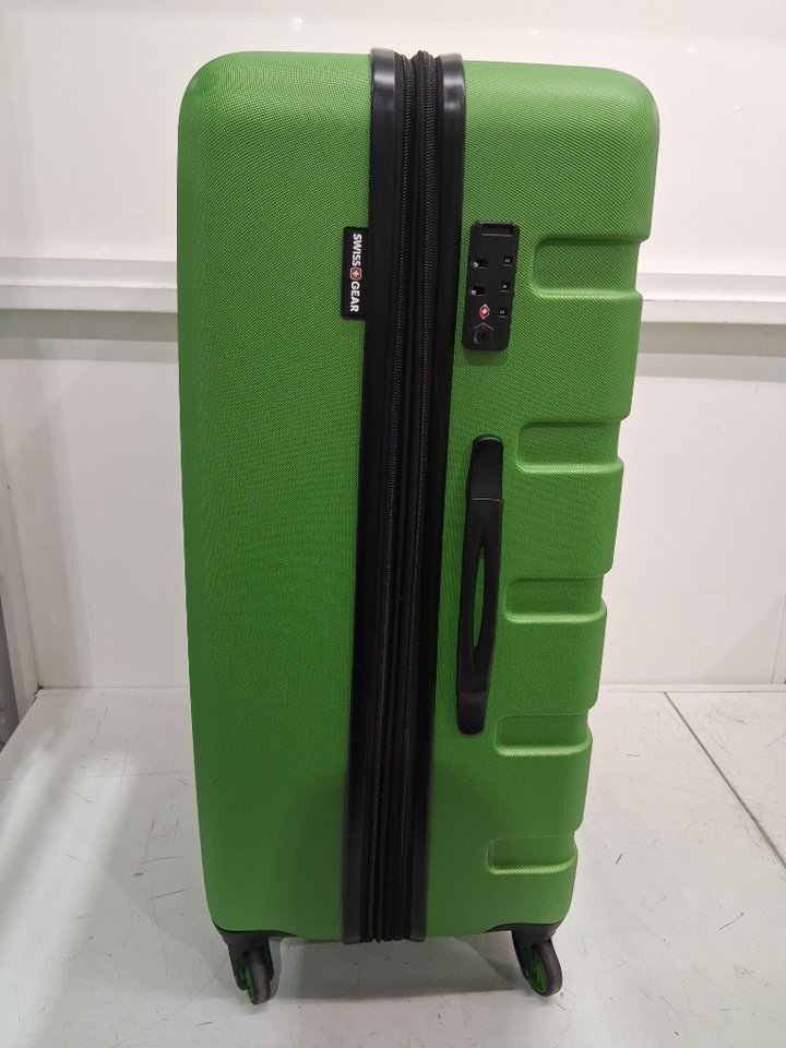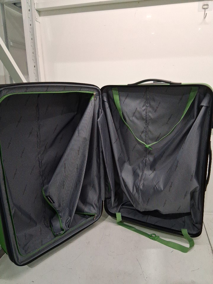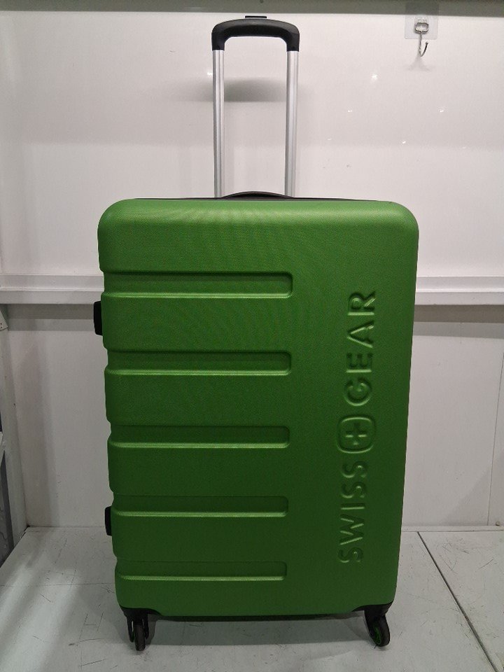 The suitcase has some scuff marks and scratches on it, and the wheels also show signs of previous use.