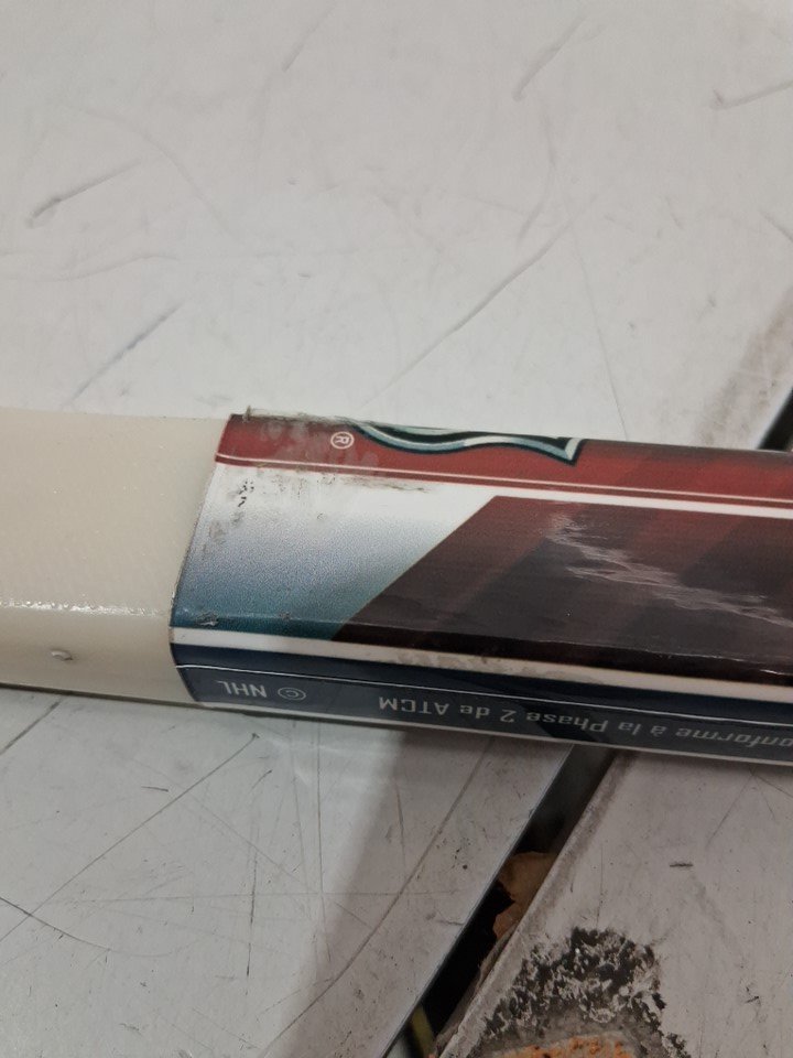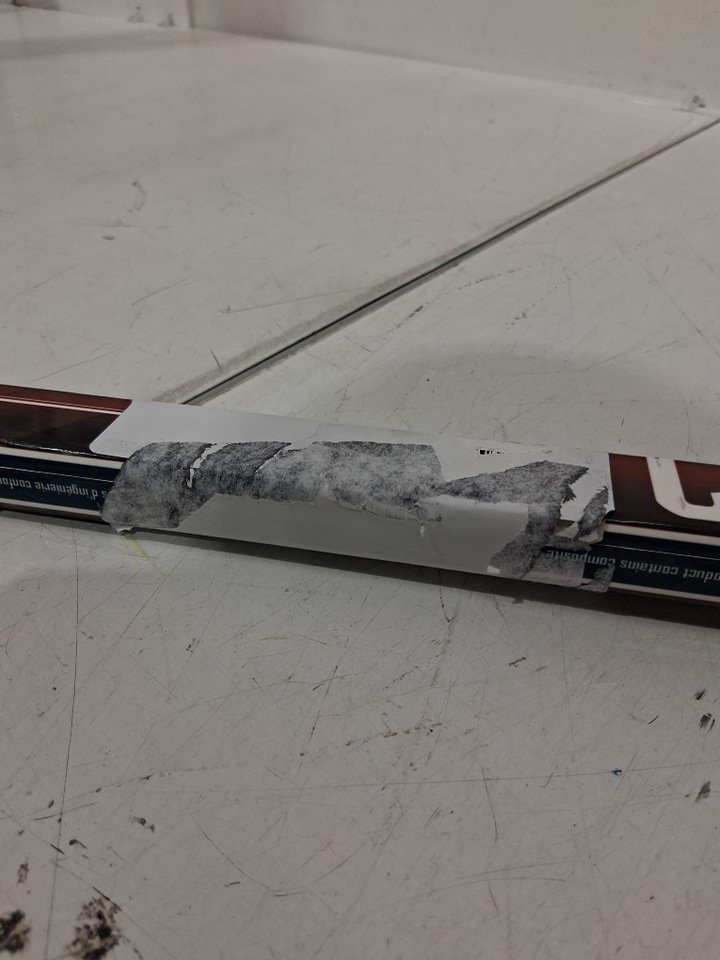 Has a shipping sticker and some sticker residue on the surface. Also is slightly scuffed.
