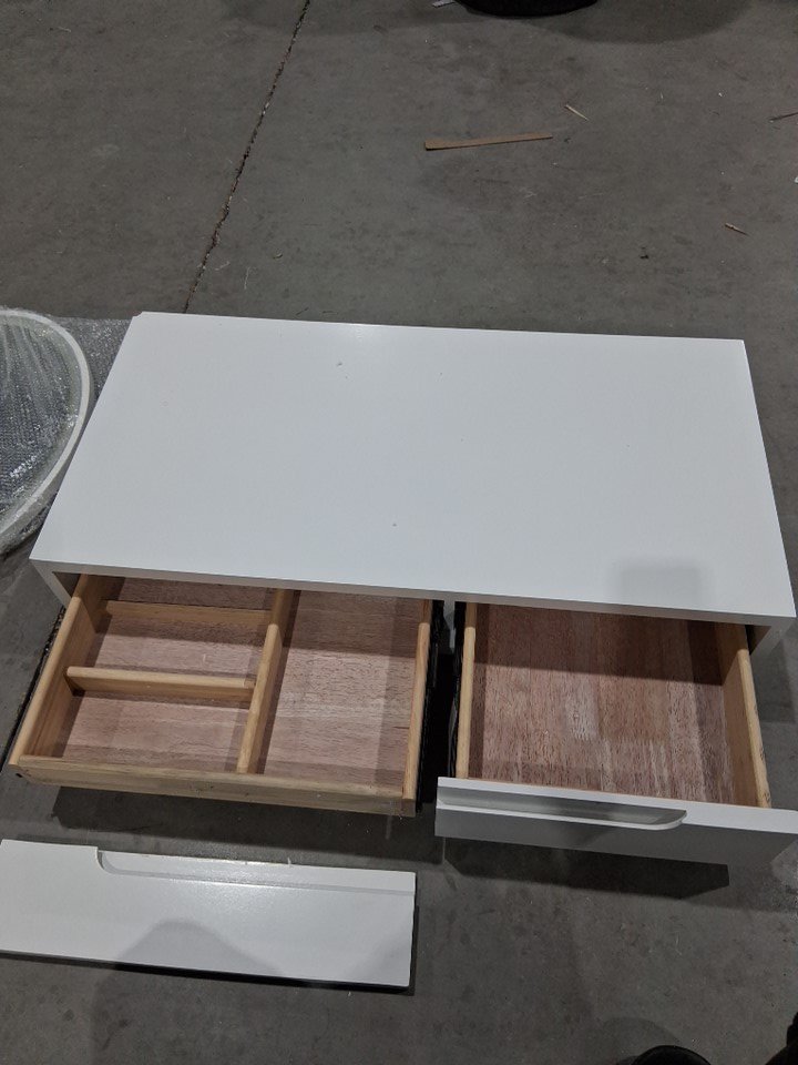 THE FRONT PANEL ON ONE OF THE DRAWERS HAS BEEN DETACHED AND SOME CHIPPINGS PRESENT, SEE PHOTOS.
