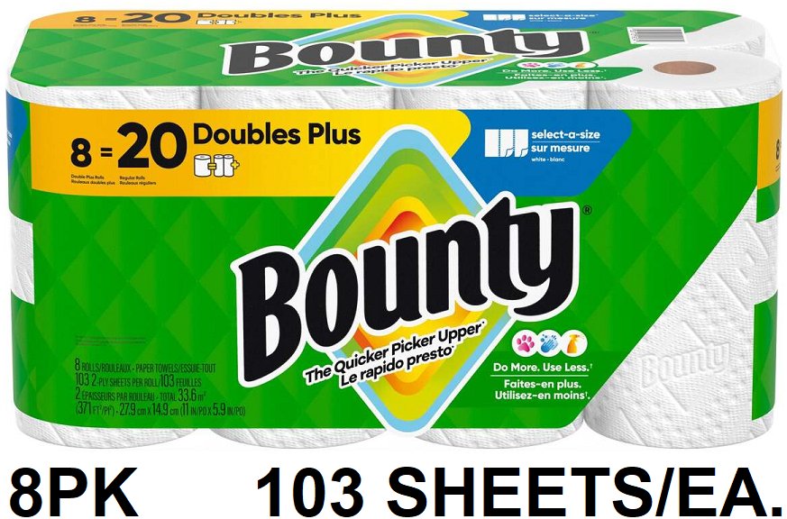 8pk bounty double plus paper towel rolls - 103 sheets/roll - white