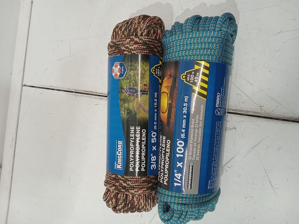 2 ASSORTED MICRO KINGCORD POLYPROPYLENE 32 STRAND DIAMOND BRAID ROPE - 1/14"X100FT / 3/8"X50FT - ASSORTED COLORS