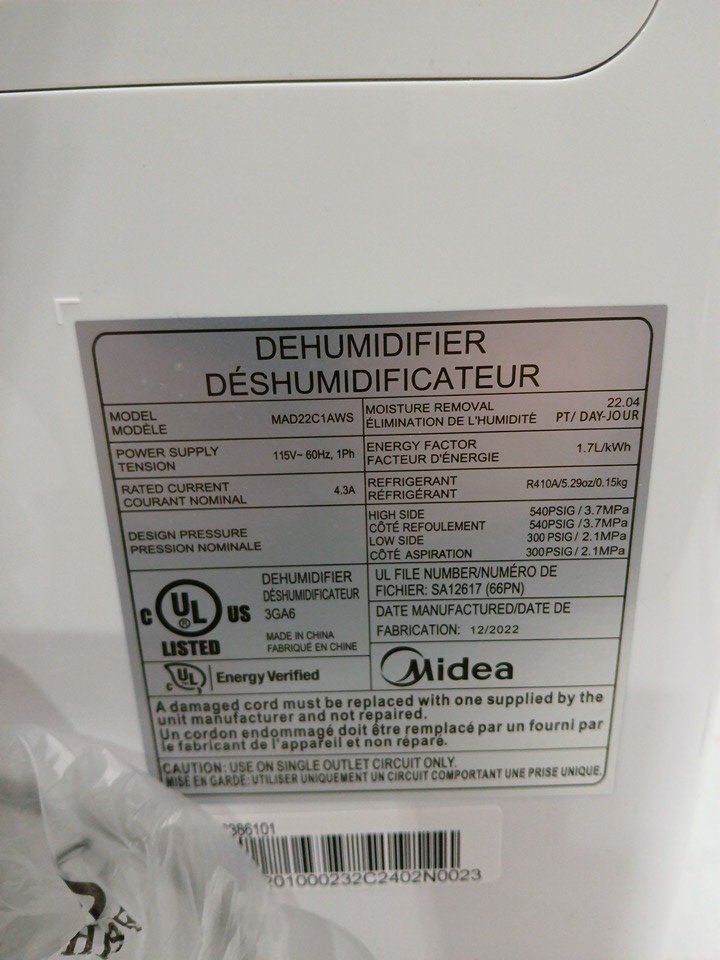 MIDEA EASYDRY DEHUMIDIFIER WITH DIGITAL DISPLAY - 1500SQ.FT. COVERAGE - WHITE (MODEL: MAD22C1AWS)